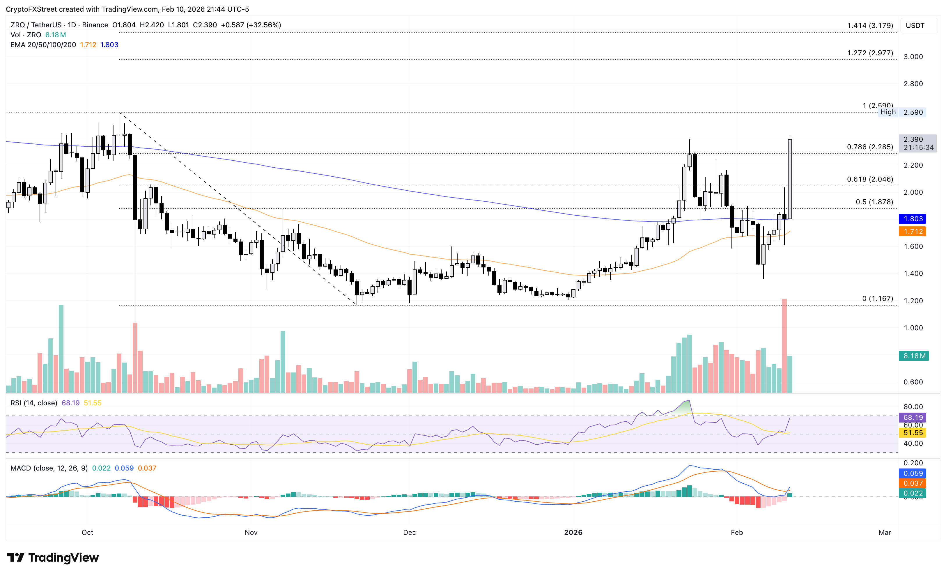 ZRO token has surpassed the 78.6% Fibonacci retracement level at $2.28, measured from the October 7 high at $2.59 to the November 21 low at $1.16. A decisive close above $2.28 would likely extend this rally toward $2.59, while the next resistance is at the 1.272 Fibonacci extension at $2.97.