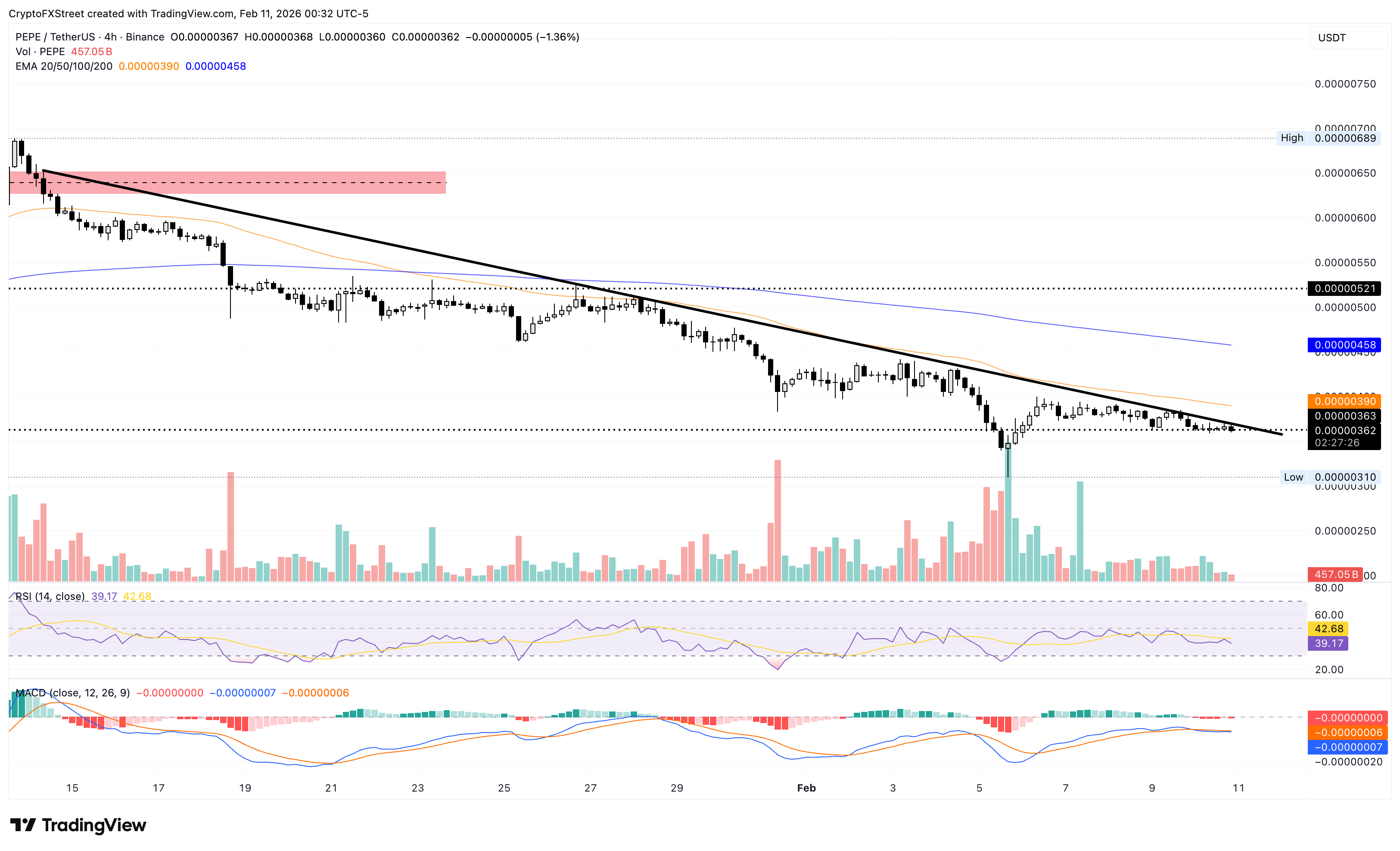 On the 4-hour chart, the frog-themed meme coin is reversing from a resistance trendline toward the February 6 low at $0.00000310.