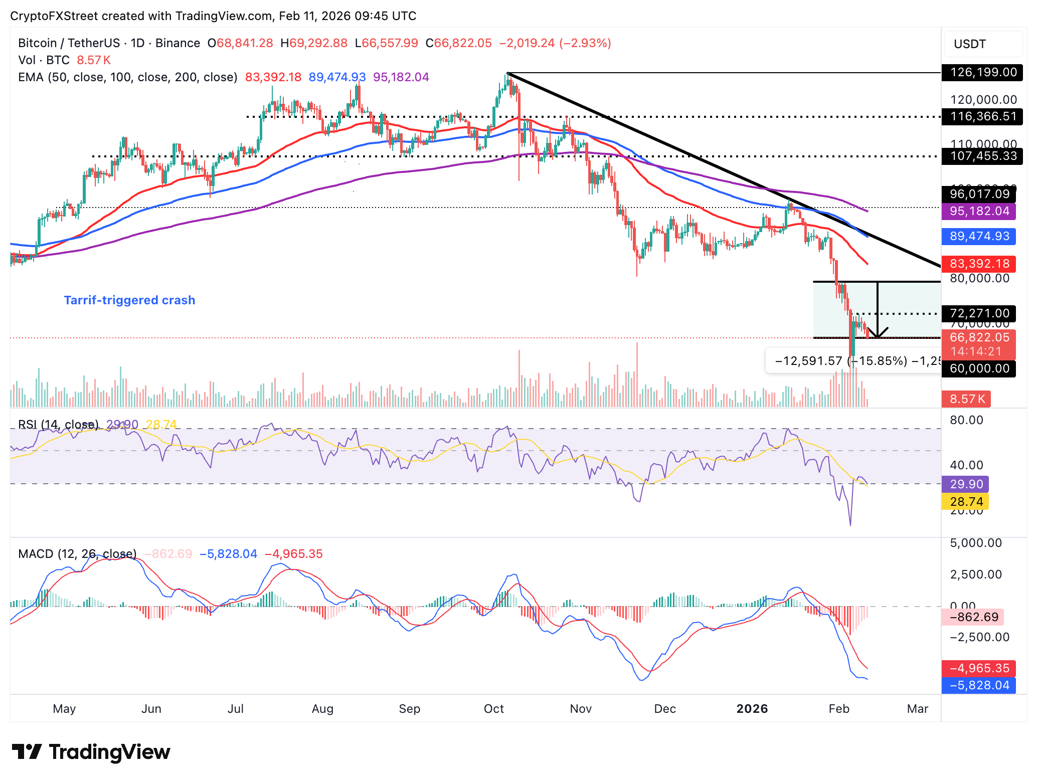 Bitcoin falls below $67,000 as selling pressure intensifies across the crypto market on Tuesday. The downward-facing 50-day Exponential Moving Average (EMA) at $83,392, the 100-day EMA at $89,475 and the 200-day EMA at $95,182 uphold the overall bearish momentum.