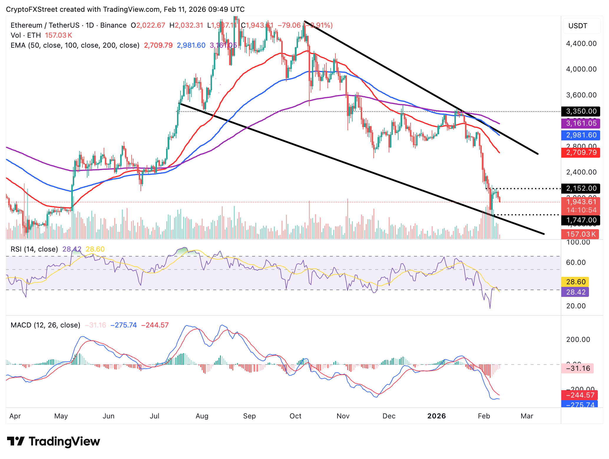 Ethereum is trading down toward $1,900 while its upside is limited by resistance at $2,152, last tested on Monday. The primary outlook is bearish, as reflected by the RSI at 28 on the daily chart, which is in oversold territory. Failure to rebound at $1,900 could push ETH toward Friday's low at $1,747.