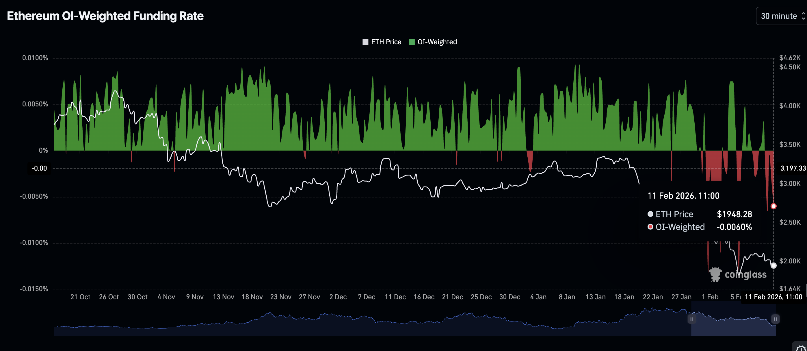 Ethereum paints a similar grim outlook, with the OI-Weighted Funding Rate remaining in negative territory at -0.0060% on Wednesday, a slight improvement from -0.0066% on Tuesday.
