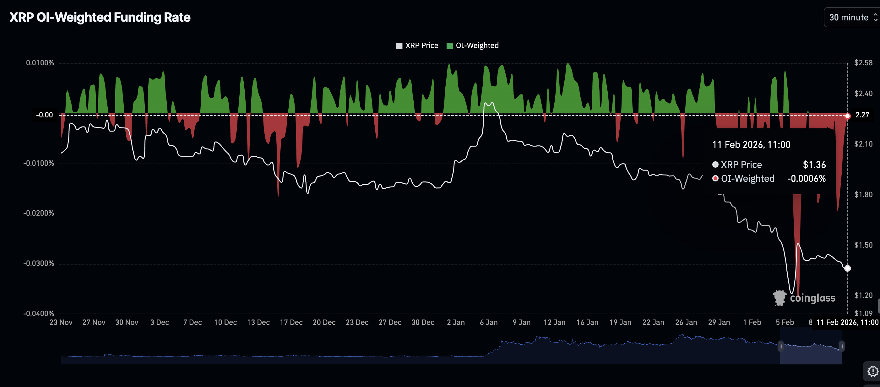 • XRP extends losses to $1.36 as futures Open Interest fades and crypto market sentiment holds in extreme fear.