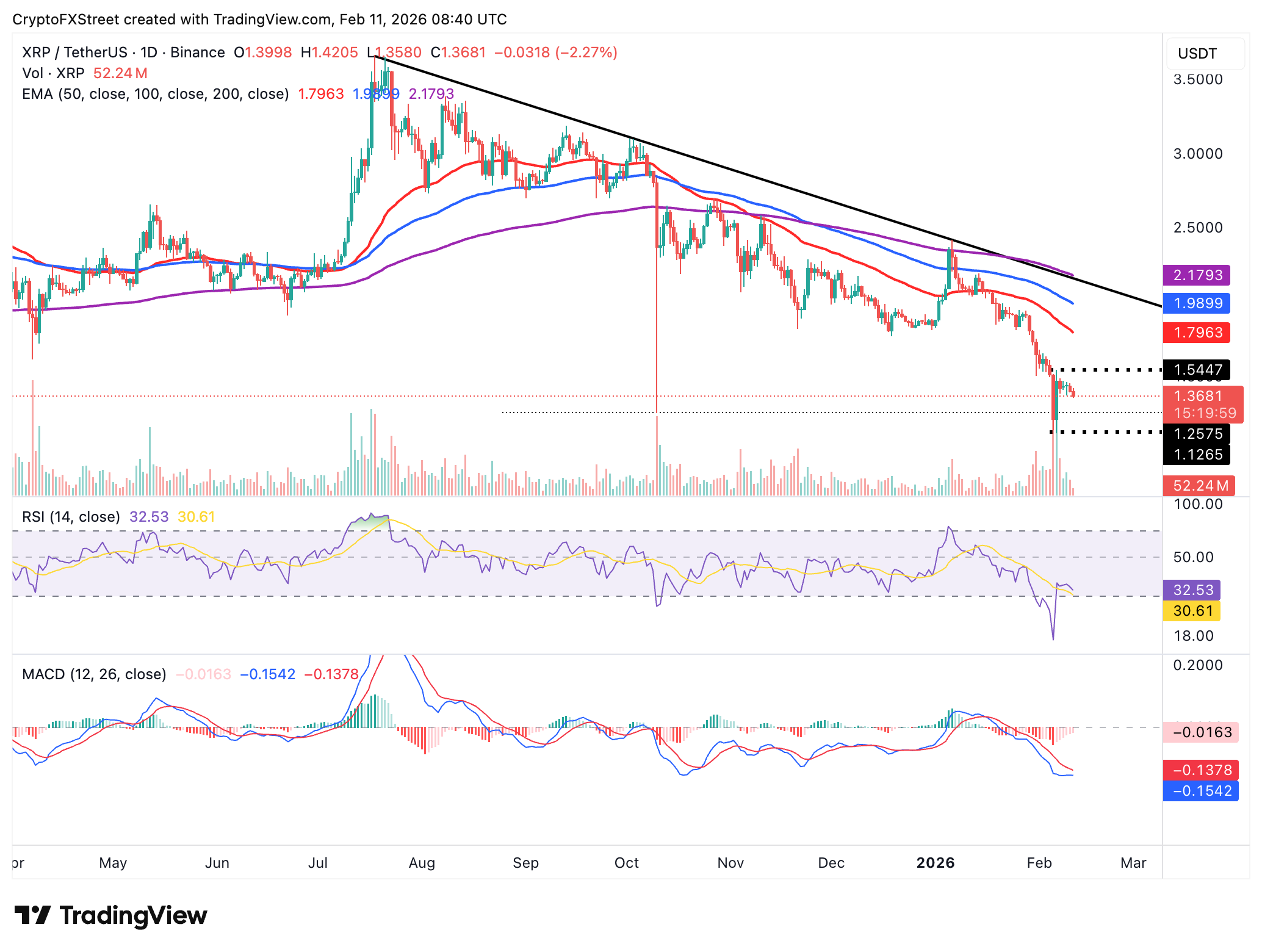 XRP, on the other hand, is trading under heavy selling pressure, down over 2% intraday to $1.36. The remittance token trades well below the downward-sloping 50-day EMA at $1.80, the 200-day EMA at $1.99, and the 200-day EMA at $2.18. All three moving averages signal a steady downtrend that could retest the October 10 low at $1.25 and Friday's low at $1.12.