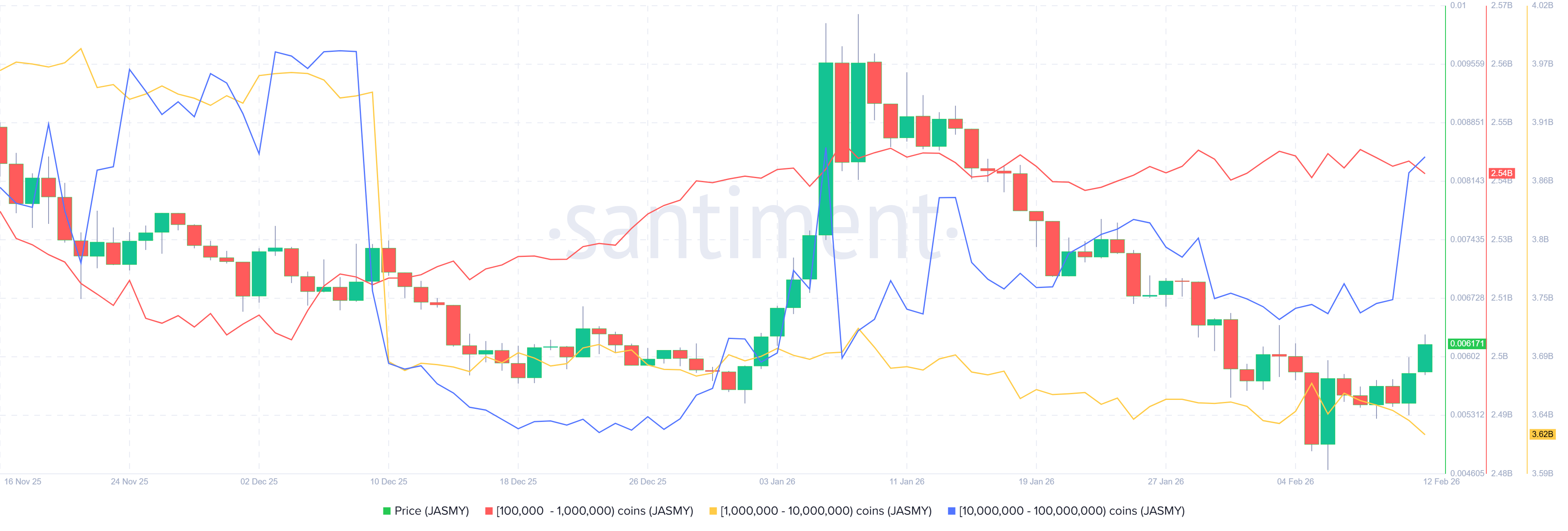 The metric indicates that whales holding between 10 million and 100 million tokens (blue line) have accumulated 140 million Jasmy tokens since Monday. During the same period, 1 million and 10 million JASMY tokens (yellow line) have shed, 30 million tokens. This shows that the first set of whales seized the opportunity and accumulated JasmyCoin at a discount.