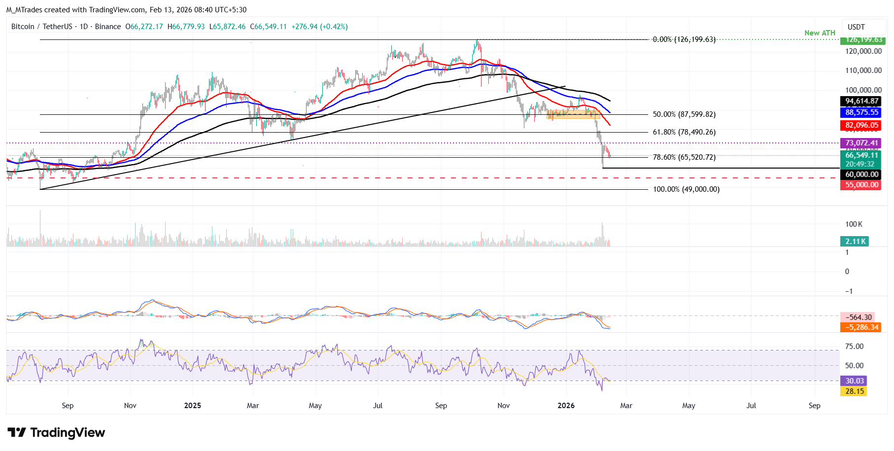 If BTC breaks and closes the 78.6% Fibonacci retracement (drawn from the August 2024 low of $49,000 to the October 2025 all-time high of $126,199) at $65,520, it could extend the decline toward the February 6 low at $60,000.