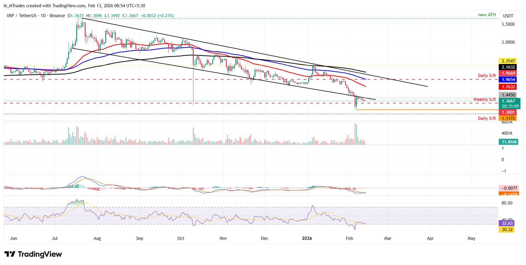 XRP revisited the broken trendline boundary of a falling wedge on February 6 and has been facing rejection around that level, declining 7% through Thursday. As of Friday, XRP is trading below $1.36.