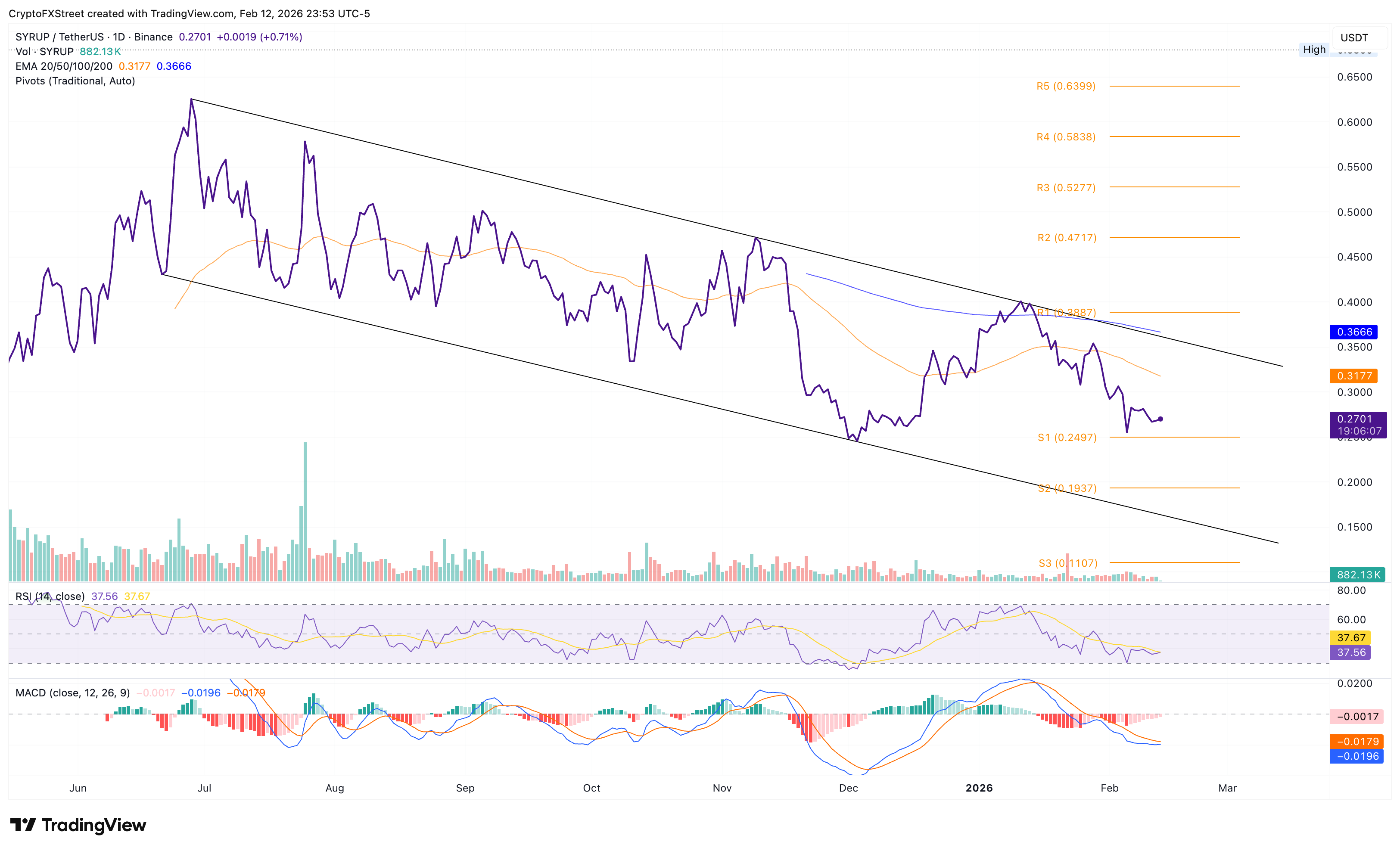 • SYRUP hovers above $0.2700 on Friday, hinting at a potential rebound within a larger descending channel pattern.