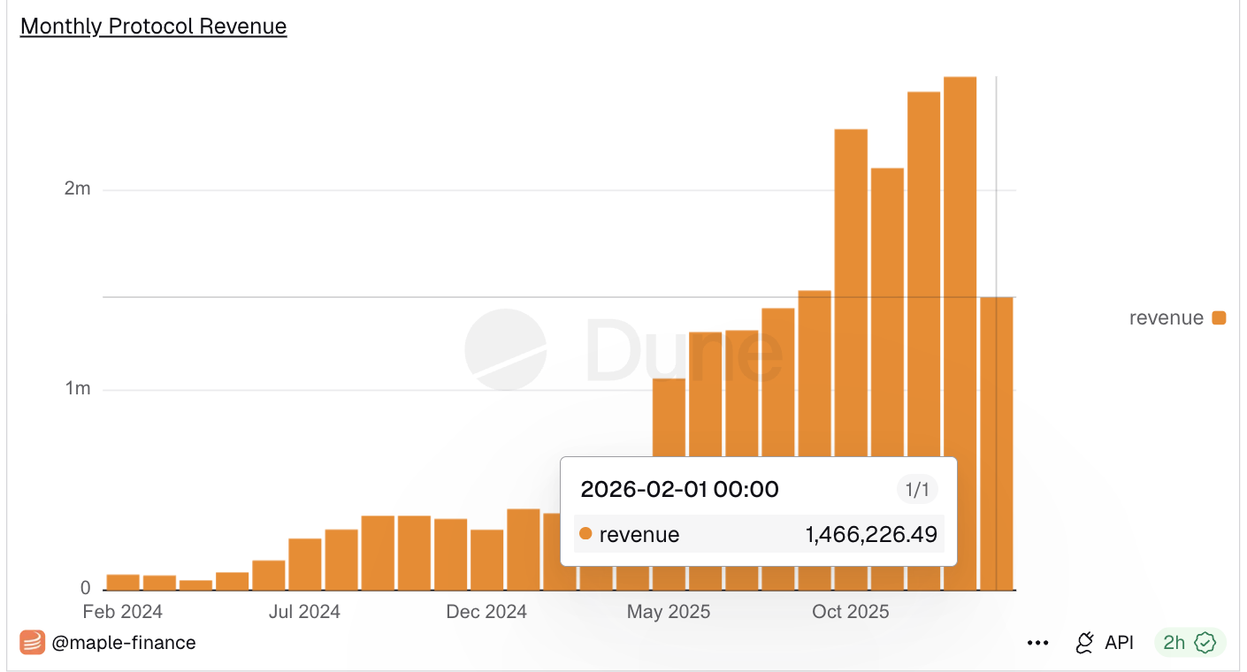 Dune dashboard data indicate that Maple Finance recorded revenue of $1.46 million so far this month, after reaching a record high of $2.57 million in revenue, primarily from lending fees and yield optimization. This reflects a steady increase in monthly revenues, building on the $2.49 million collected in December.