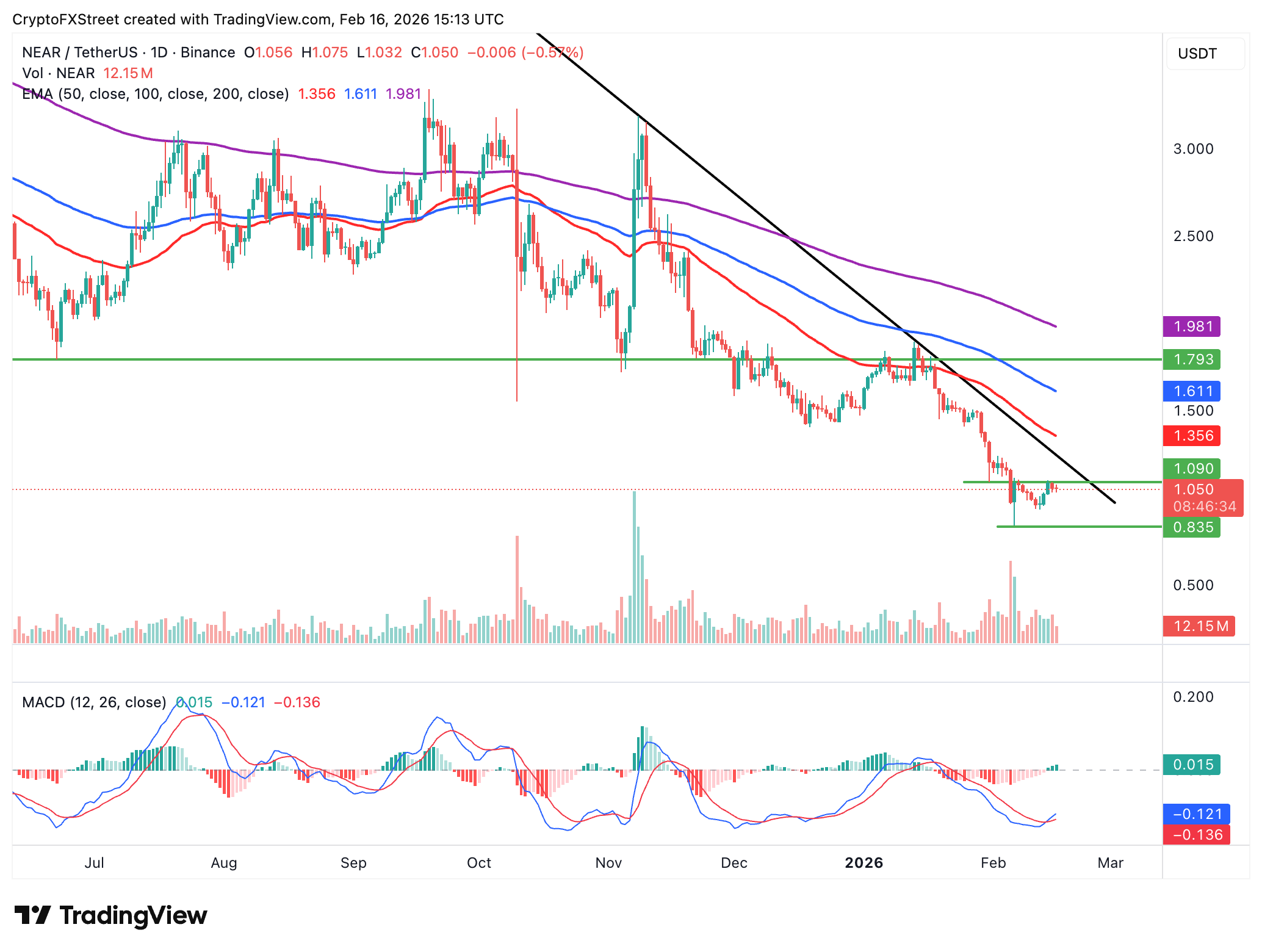 Near Protocol (NEAR), on the other hand, exhibits structural weakness, with the second-largest AI token by market capitalization trading well below its 50-day EMA at $1.35, 100-day EMA at $1.61, and 200-day EMA at $1.98. All three moving averages are sloping downward, preserving the short-term bearish outlook.