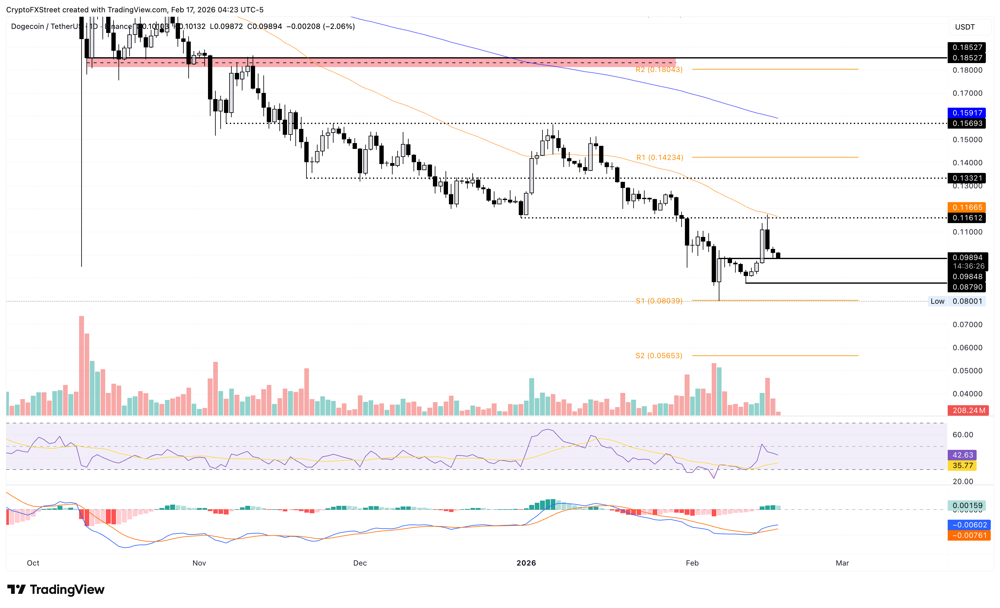 Dogecoin is trading below the $0.1000 psychological level at press time on Tuesday, recording a 2% decline so far on the day. The dog-themed meme coin extends the decline for the third consecutive day, testing the February 6 closing price of $0.0984.