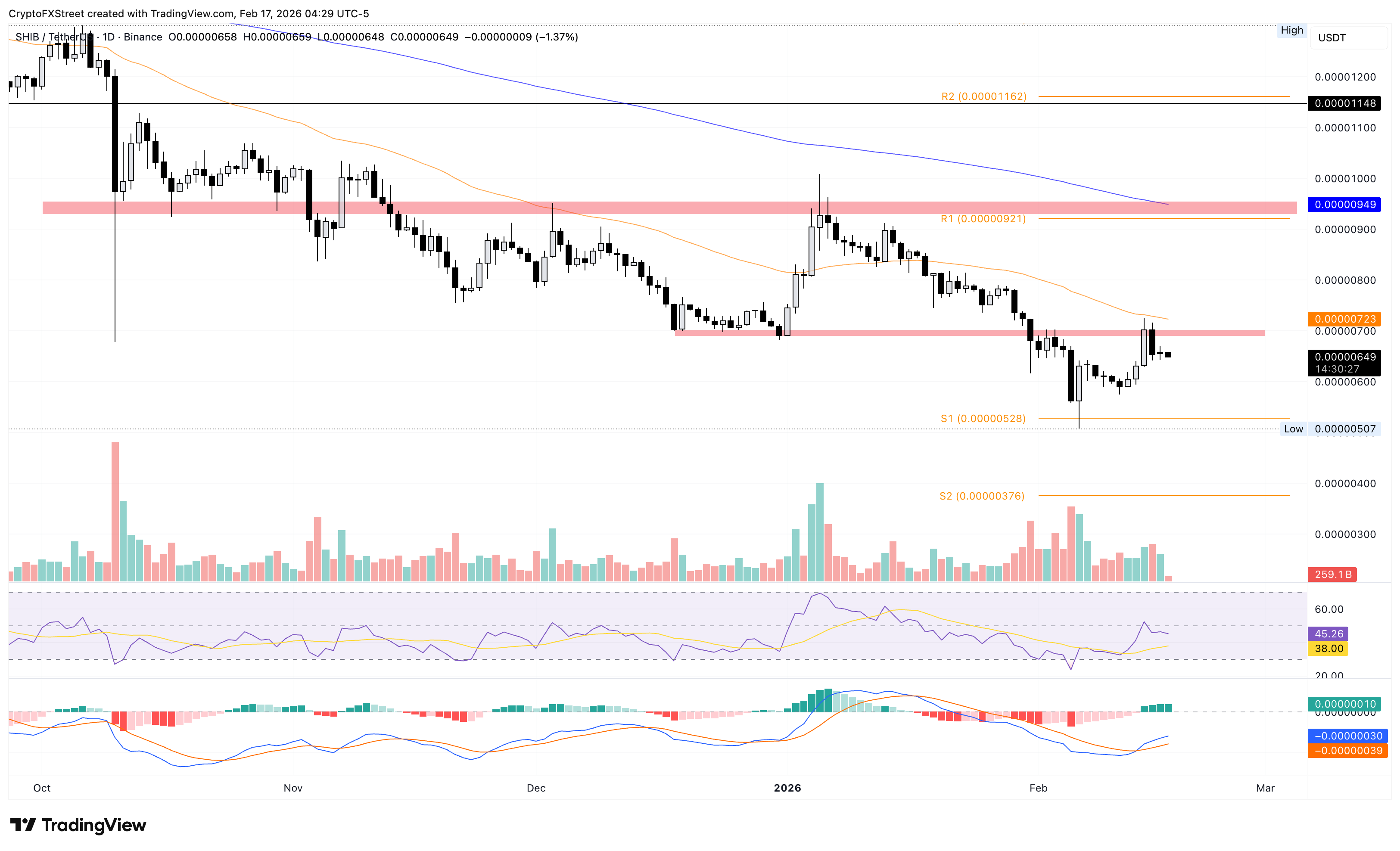 Shiba Inu is down 1.67% at the time of writing on Tuesday, extending its reversal from the $0.00000700 supply zone. The path of least resistance indicates a pullback to the S1 pivot point at $0.00000528, with a downside potential of approximately 20%.