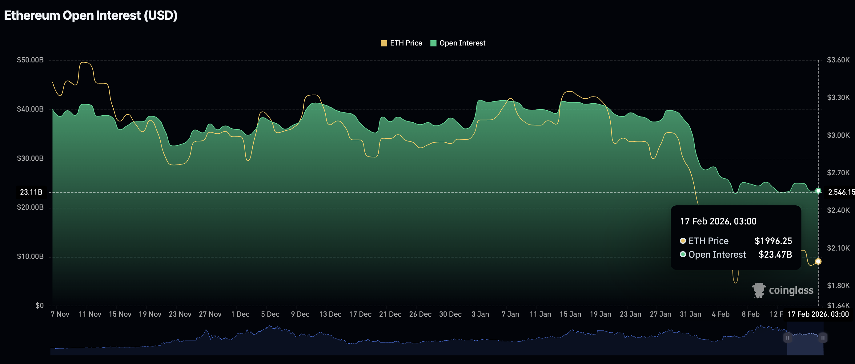 Ethereum exhibits a similar weak-derivatives structure to Bitcoin, as futures OI stabilises around $23.47 billion on Tuesday, according to CoinGlass data. Since ETH hit a historical high of $4,956 in August, retail investors have significantly reduced exposure, as futures OI peaked at $70.13 billion at that time. A further decline in OI would weigh on Ethereum, limiting its upside, while increasing the odds of an extended downtrend.