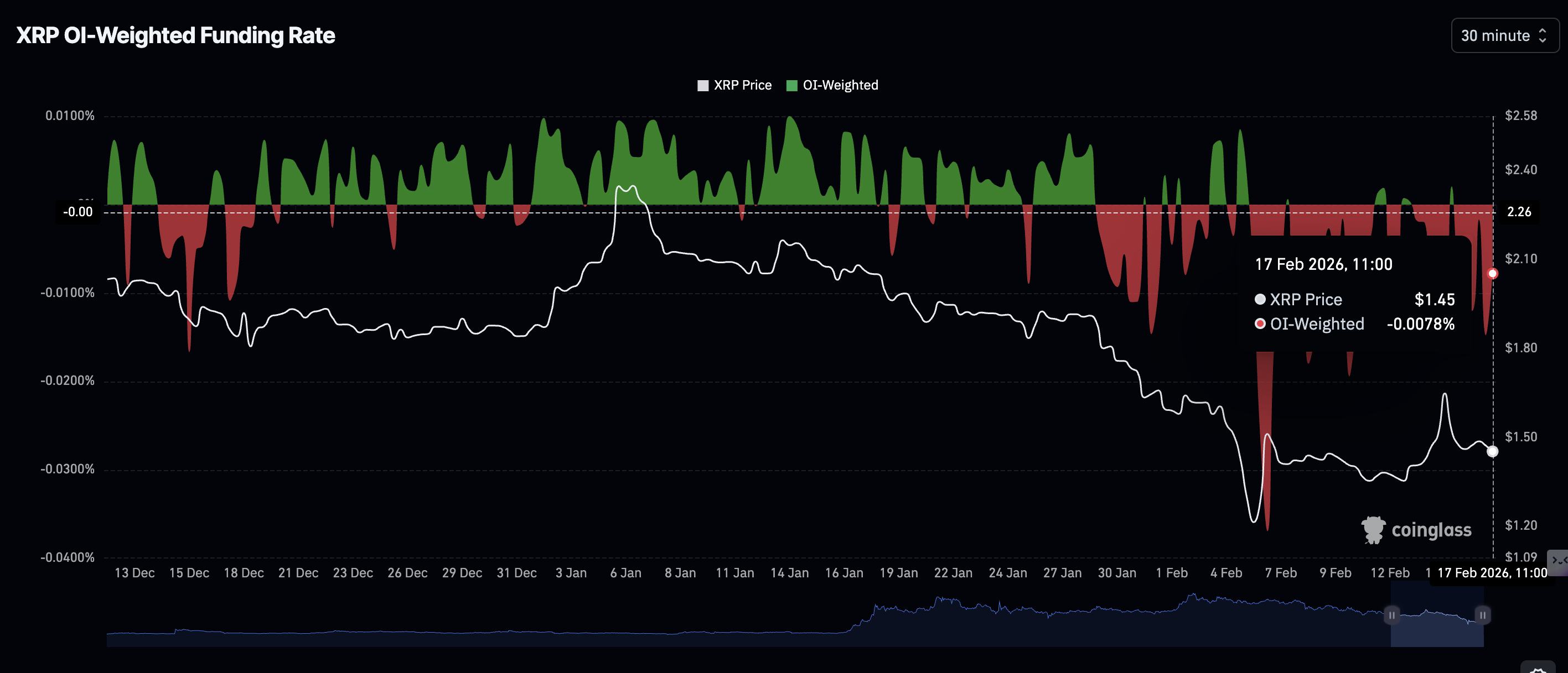 CoinGlass data shows that traders are increasingly piling into short positions, suggesting a lack of conviction in XRP’s short-term bullish outlook. The OI-Weighted Funding Rate holds at -0.0078% on Tuesday, remaining in the negative region since Sunday. Without follow-through momentum, price fluctuations will persist amid an overall bearish trend.