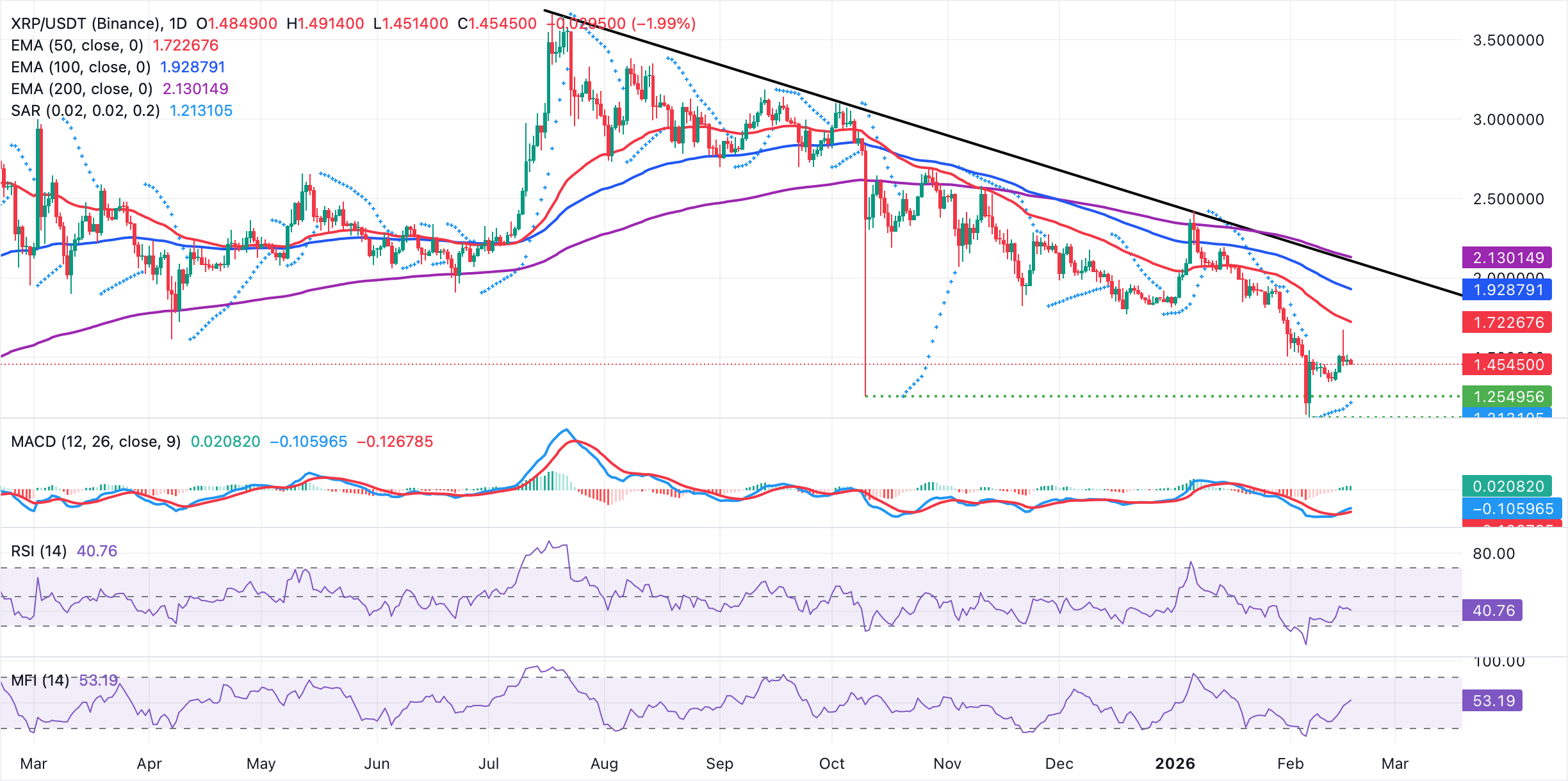 XRP hovers above $1.45 while sitting well below the 50-day Exponential Moving Average (EMA) at $1.72, the 100-day EMA at $1.93 and the 200-day EMA at $2.13. All three moving averages are descending, confirming a deteriorating technical structure and increasing the odds of prolonging the ongoing correction.