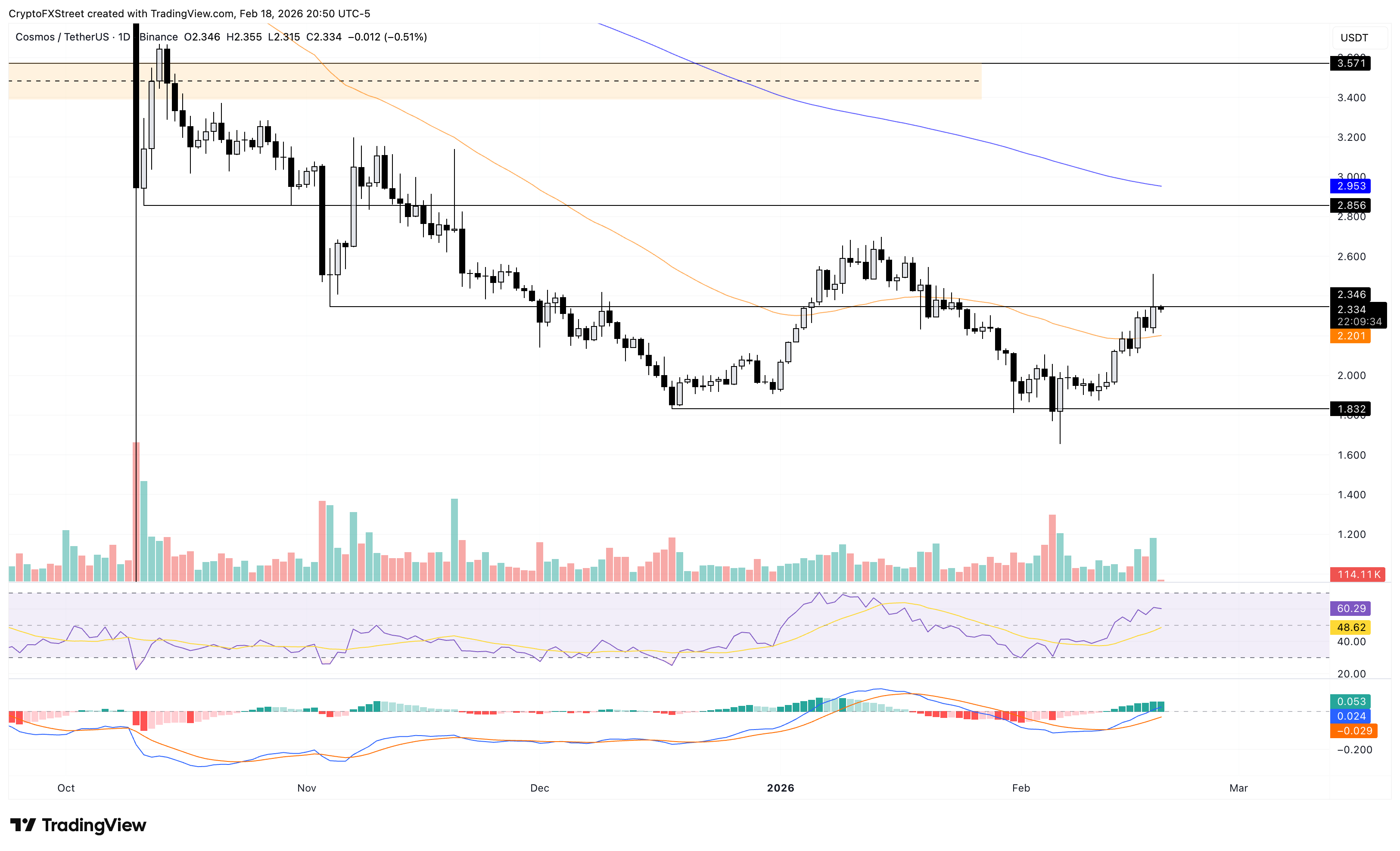 Cosmos holds steady above the $2.300 level after a 4% rebound from the 50-day EMA at $2.201 on the previous day. However, the $2.346 resistance level marked by the November 4 low caps the intraday gain.