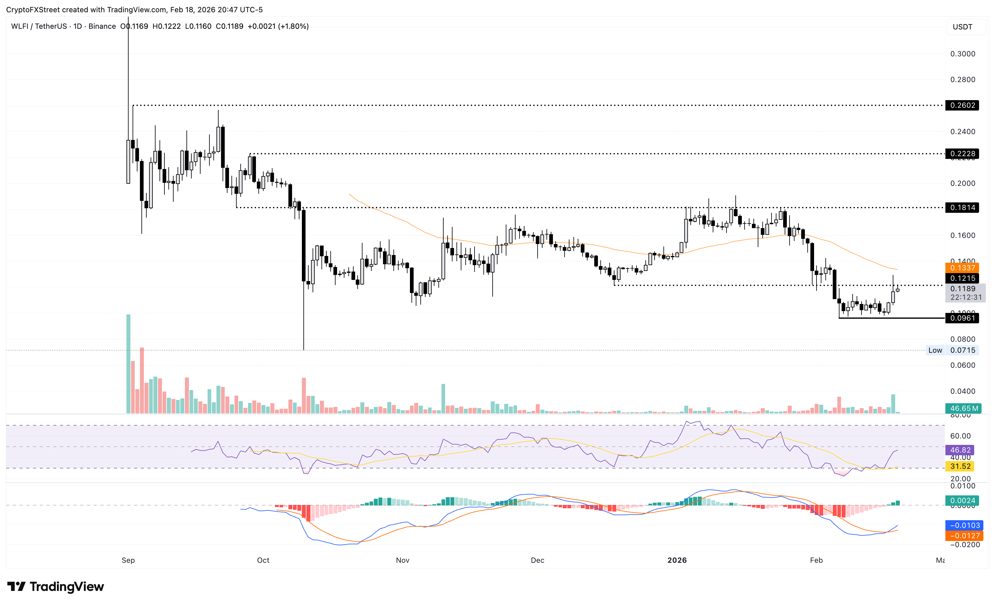 The WLFI token encounters resistance at $0.1215, aligning with the December 18 low. A decisive close above this level would extend the WLFI rally to the 50-day Exponential Moving Average (EMA) at $0.1337.