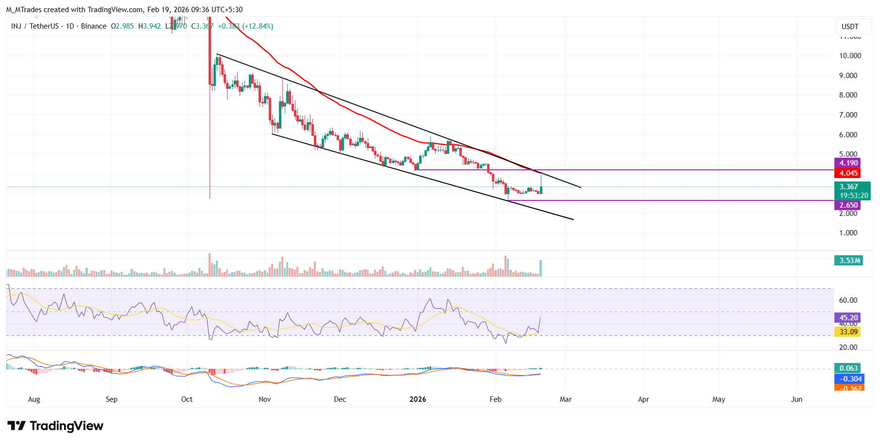 If INJ breaks and closes above this trendline boundary, it could extend the rally toward the key psychological level at $5.