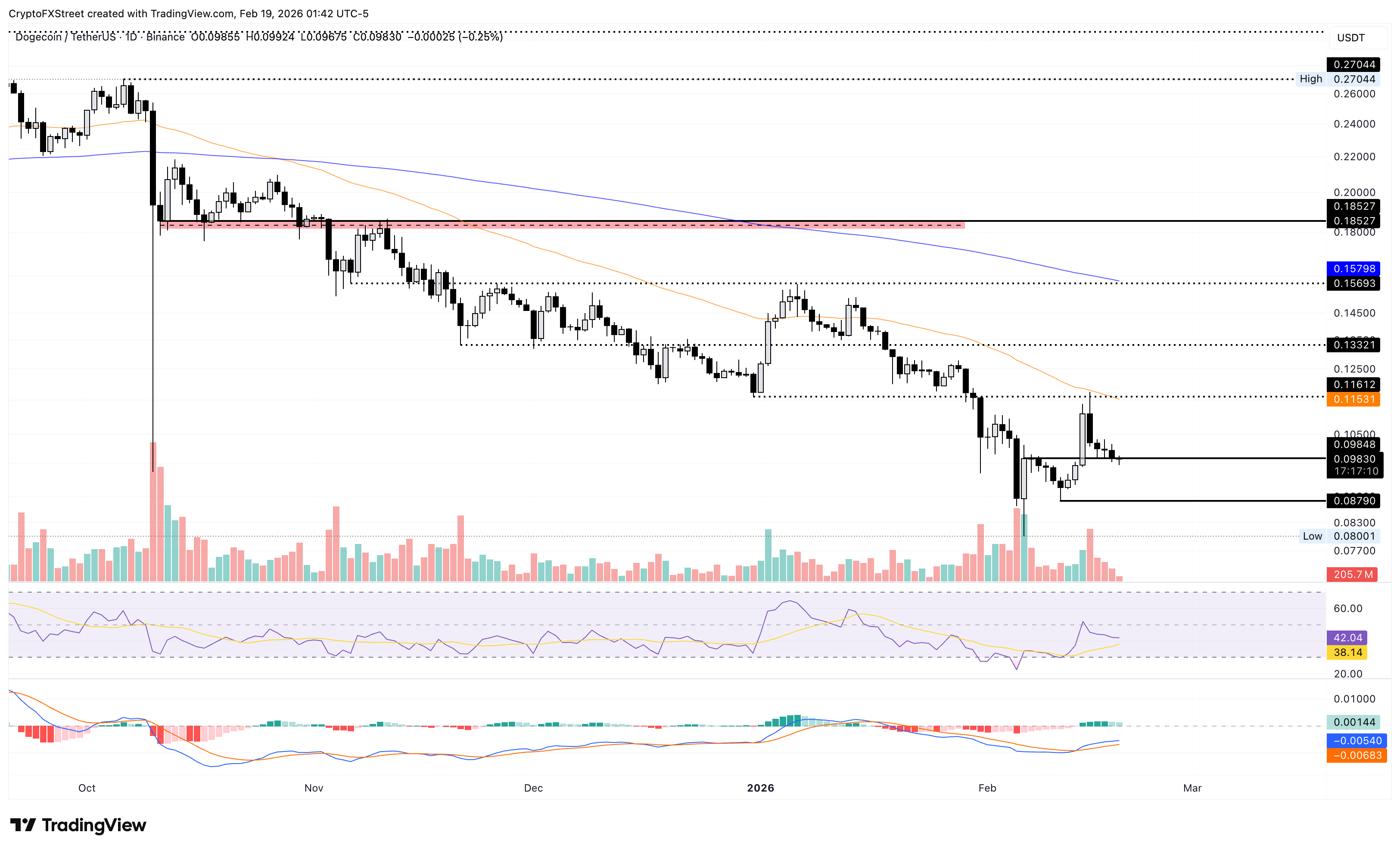 Dogecoin is trading below the $0.10000 psychological level at the time of writing on Thursday, testing a crucial support level at $0.09830 marked by the February 6 closing price. A decisive close below this level could test the February 11 low at $0.08790.