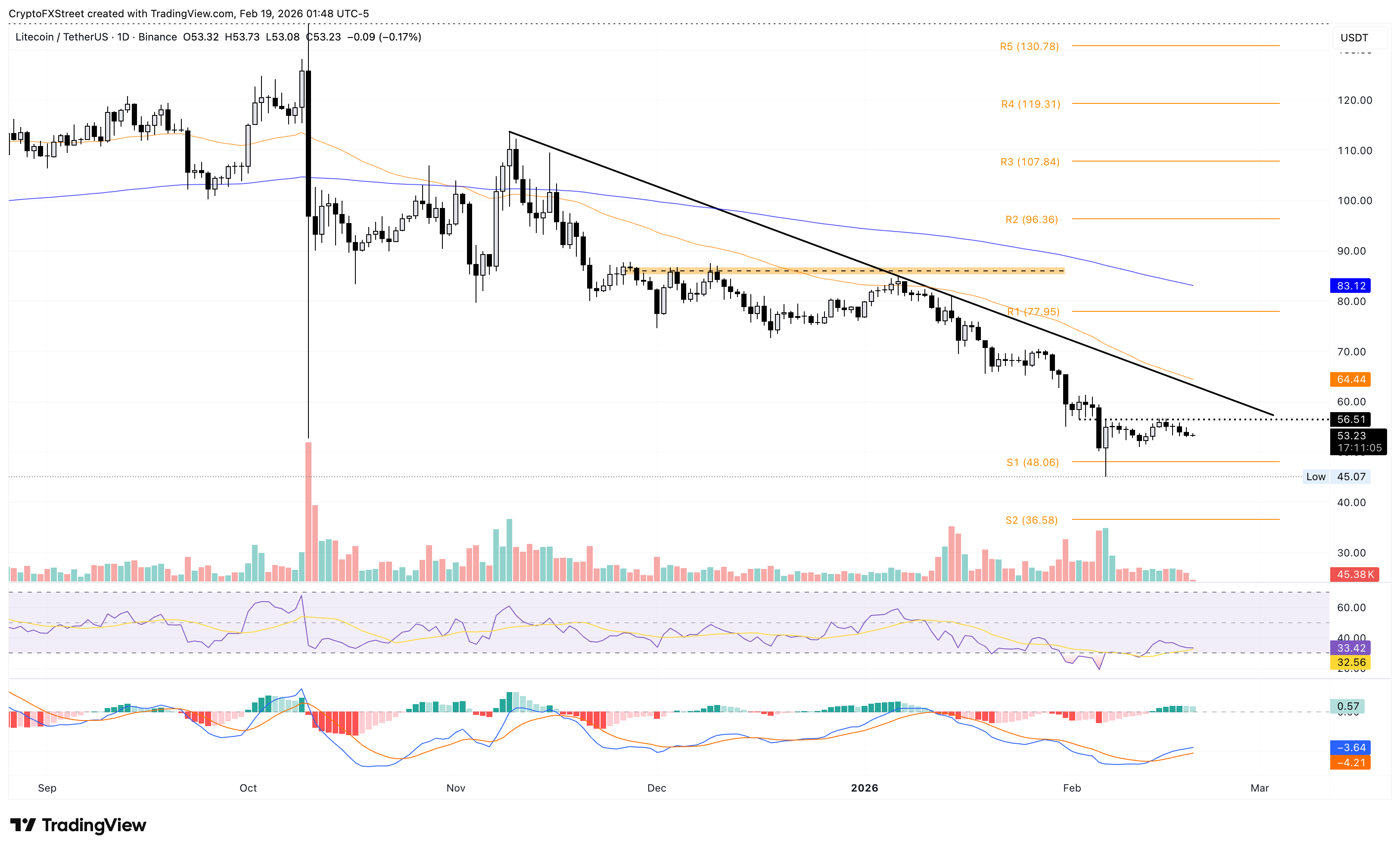 The steady decline in the 50-day and 200-day EMAs at $64.44 and $83.12, respectively, confirms the long-term bearish bias. Consistent with downside bias, the technical indicators on the daily chart suggest that sellers are tightening their grip on Litecoin. The RSI is at 33, trending toward the oversold zone, while the MACD is flashing a bearish crossover possibility, which would signal a return to bearish momentum.