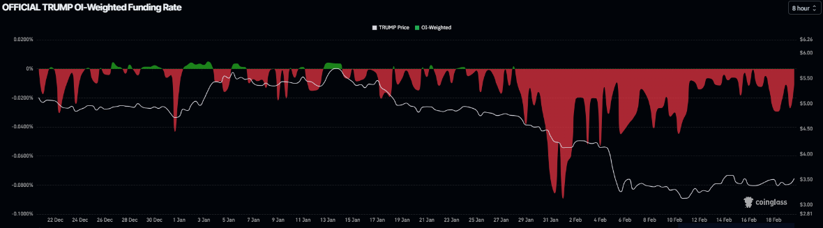 On the derivatives side, funding rates support a bearish bias. CoinGlass data shows TRUMP’s funding rate has been in a negative trend since the end of January, currently at -0.016% on Friday, indicating that short positions are paying long positions and hinting at bearish sentiment.