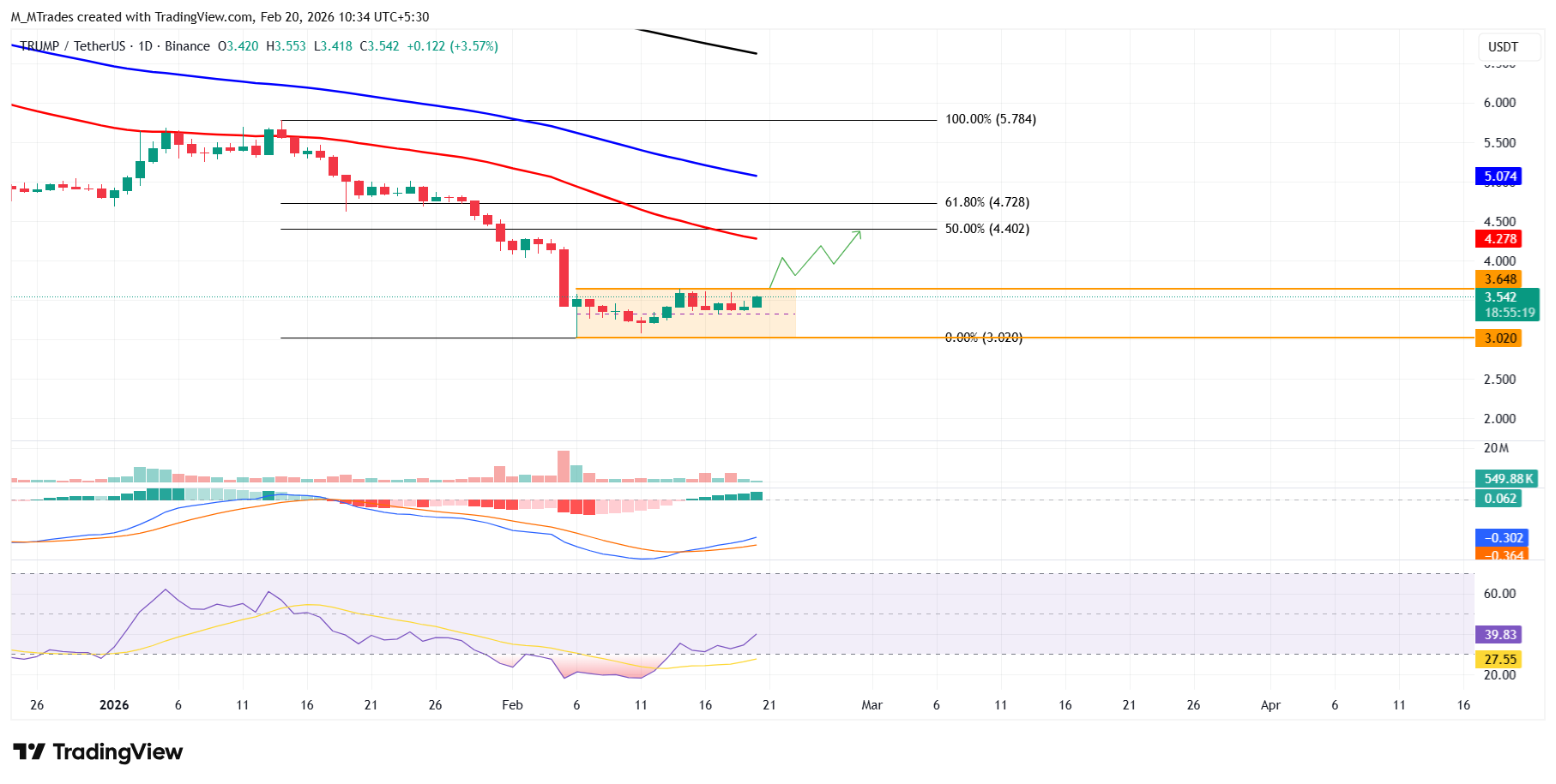 Official Trump price has been trading sideways between $3.02 and $3.64 since February 6. As of Friday, TRUMP is trading higher, heading toward the upper consolidation boundary.