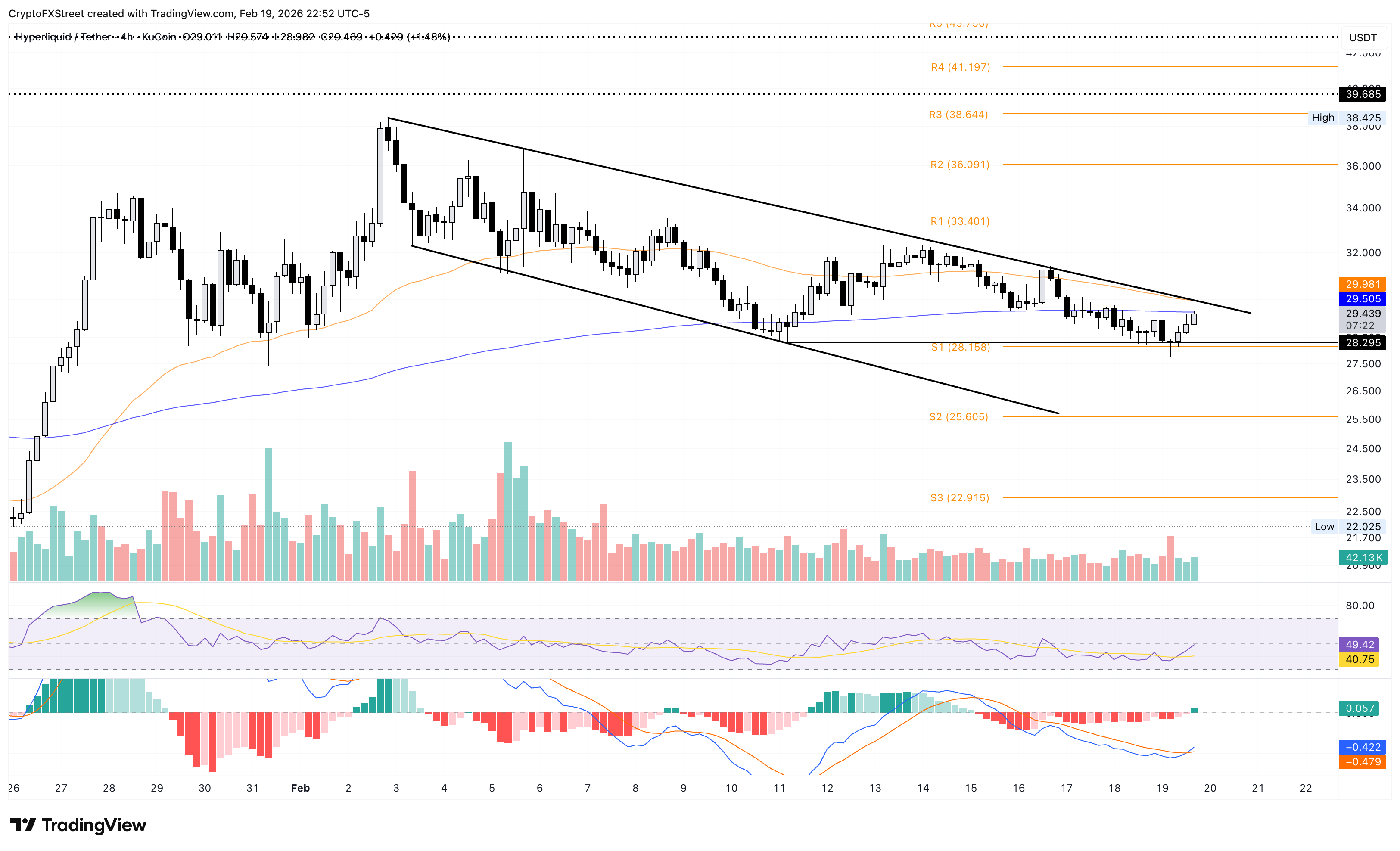 The crucial resistance for the HYPE recovery is at the confluence of the 50-period EMA at $29.95 and the descending trendline near $30, which connects the highs on February 2 and February 16.