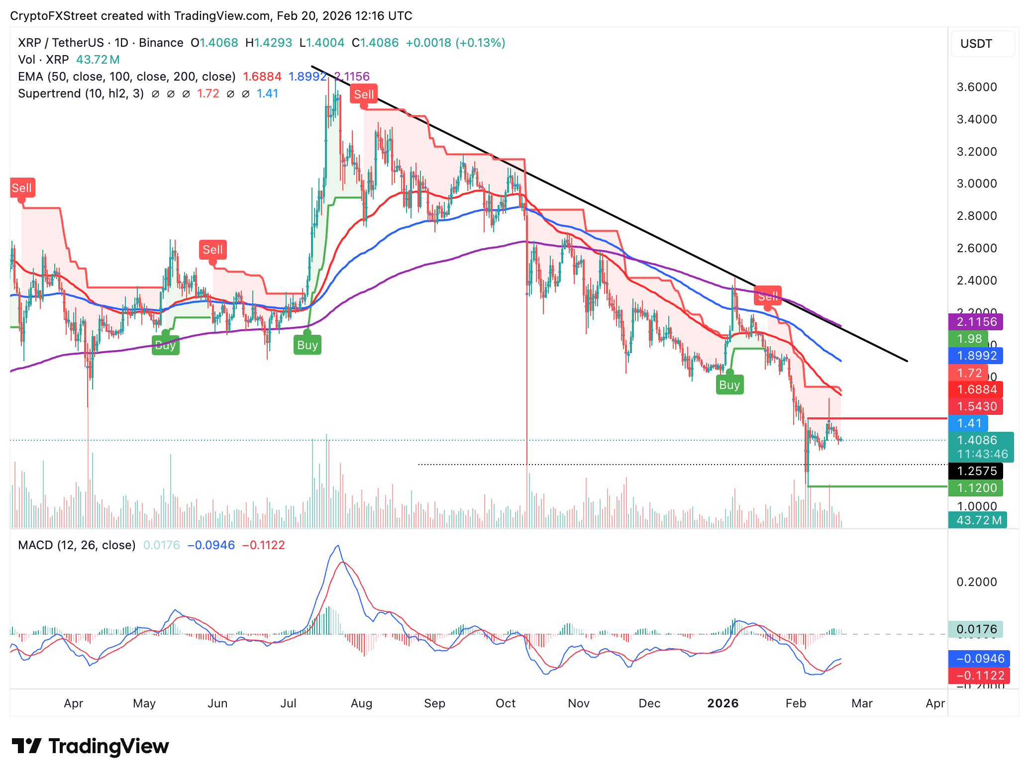Until the price rises above the SuperTrend and its colour turns green, the path of least resistance could remain adamantly downward. Subsequently, a daily close below the immediate $1.40 support may accelerate XRP downward toward the October 10 low at $1.25. The February 6 low sits slightly below at $1.12.