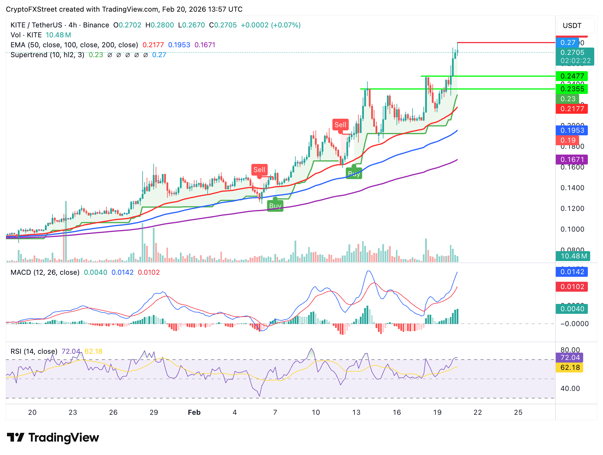 Kite hovers above $0.27, sitting well above the 50 Exponential Moving Average (EMA) at $0.22, the 100 EMA at $0.20 and the 200 EMA at $0.17 on the 4-hour chart. All three moving averages are sloping upward, preserving the overall bullish bias, besides holding in line to absorb potential selling pressure.