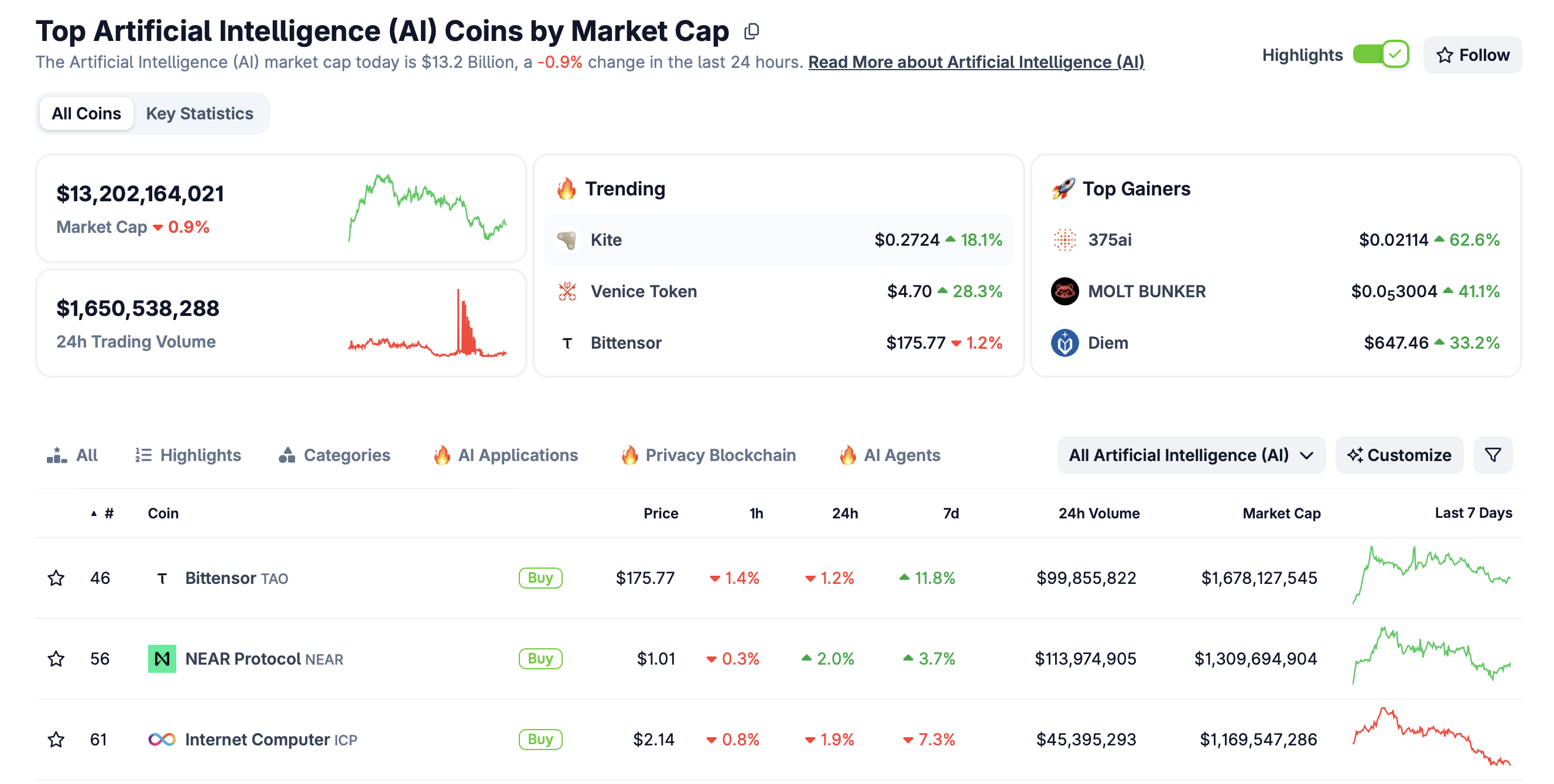 Bittensor hovers at $174, down 2% over the past 24 hours. Near Protocol holds steady at $1.00, up 1.5% over the past 24 hours, while Internet Computer (ICP) is down 2% in the same period and trading at $2.13. The AI crypto market capitalization edges lower to $13.2 billion, underscoring a sticky risk-off sentiment.