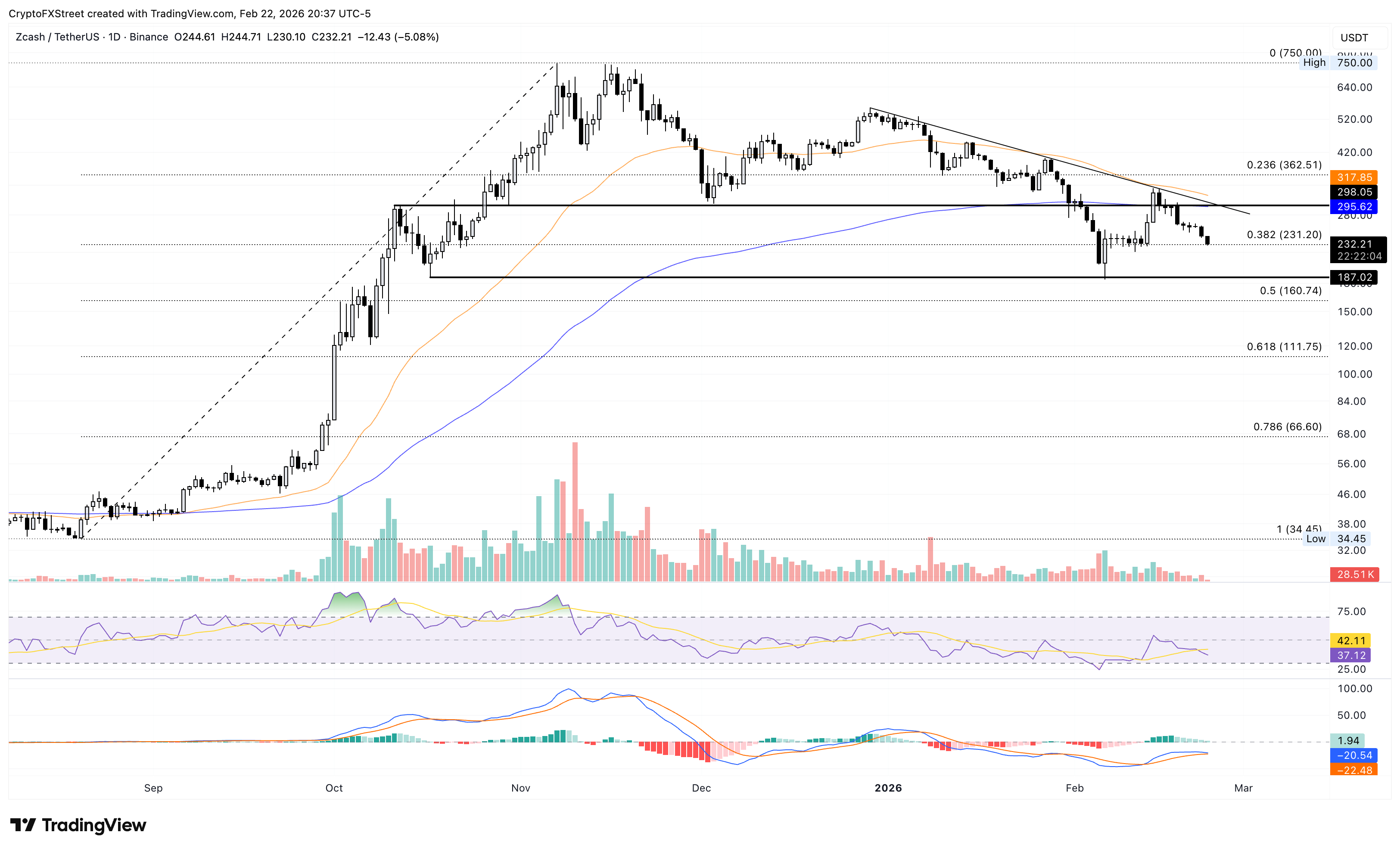 Zcash trades below $250, down 5% at the time of writing on Monday, extending the 18% loss from the previous week and bringing the total to roughly 30%. However, the 38.2% Fibonacci retracement level at $231, measured from the August 20 low at $34.45 to the November 7 high at $750 on the daily logarithmic chart, serves as immediate support.
