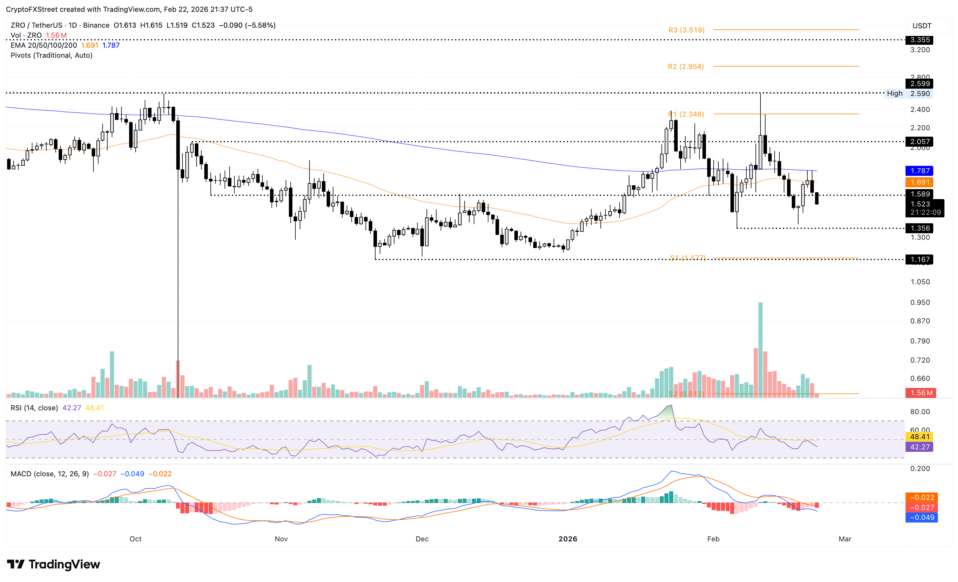 LayerZero is down more than 5% at the time of writing on Monday, approaching the $1.500 psychological support level. The ZRO token trades below the 50-day and 200-day EMAs, which are in a bearish alignment, reflecting downside pressure.