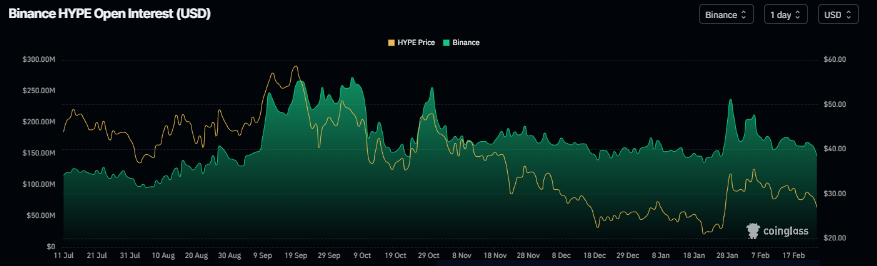 Hyperliquid futures Open Interest (OI) at Binance exchange falls to $146.15 million on Monday,  having been steadily declining since the end of January and nearing the January 21 level of $135 million. This drop in OI reflects waning investor participation and projects a bearish outlook.