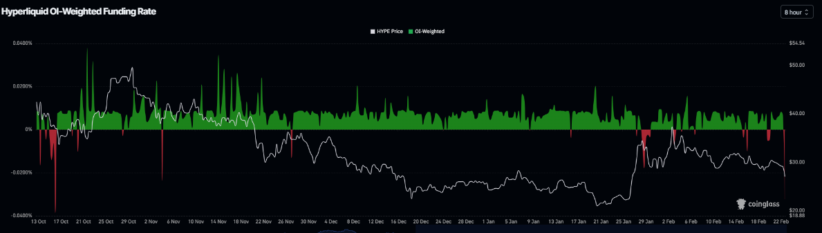 In addition, Coinglass’s OI-Weighted Funding Rate data shows a negative outlook. The metric turns negative on Monday and stands at -0.032%, nearing the October 16 levels, when HYPE dropped sharply. The negative ratio suggests that shorts are paying longs, suggesting bearish sentiment toward Hyperliquid.