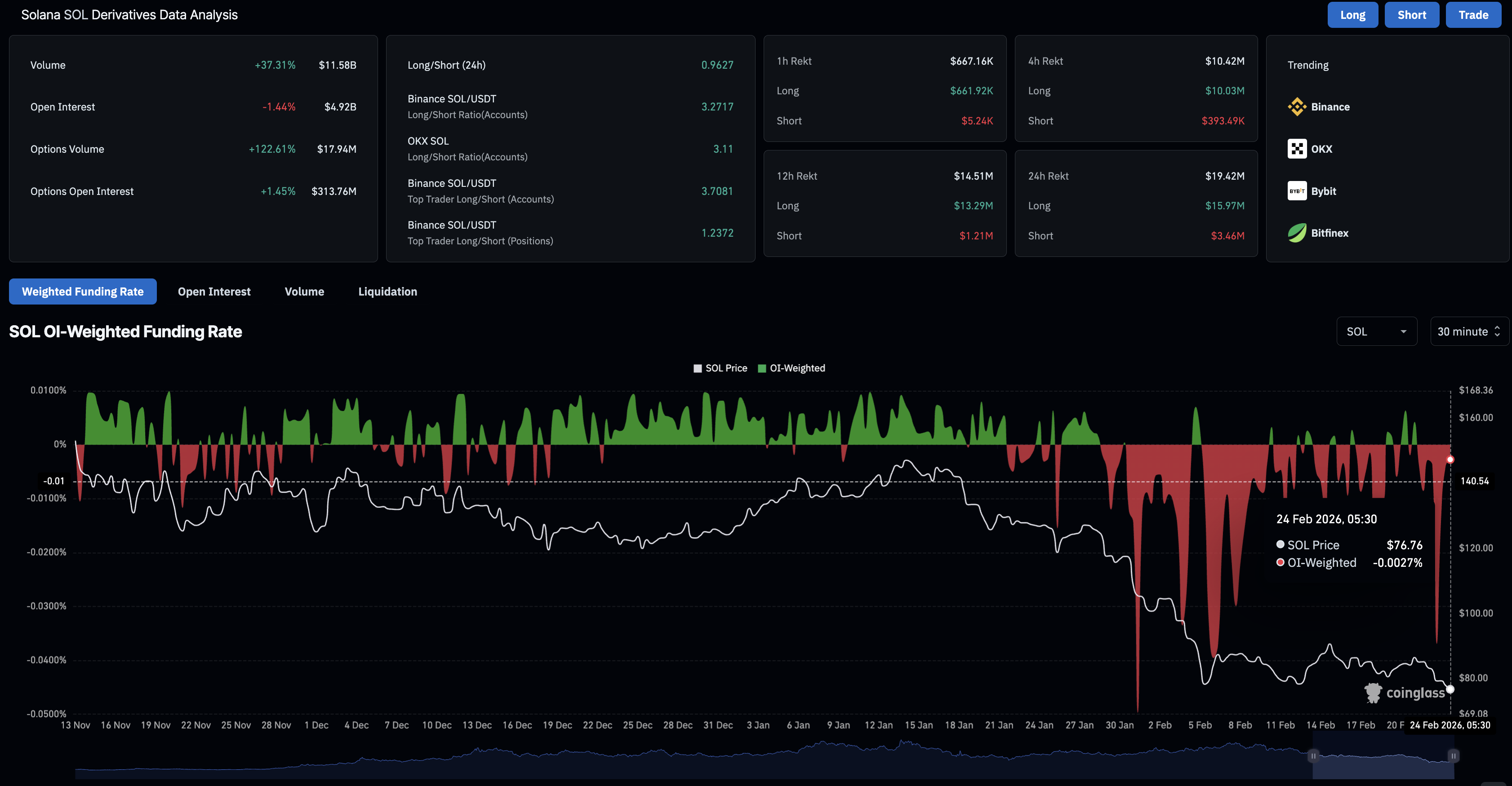 Solana approaches the 23.6% trend-based Fibonacci retracement level at $75.74, measured from the January 13 high at $148.74 to the February 15 high at $91.26, including the February 6 low at $67.50.