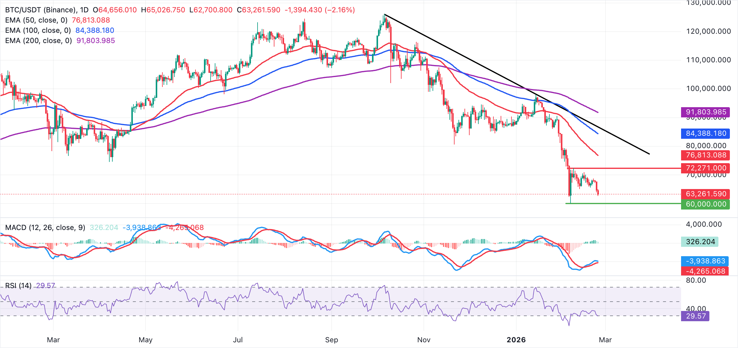Bitcoin trades at $63,261, positioned well below the 50-day Exponential Moving Average (EMA), the 100-day EMA and the 200-day EMA. All three moving averages are sloping lower, confirming a dominant downtrend.