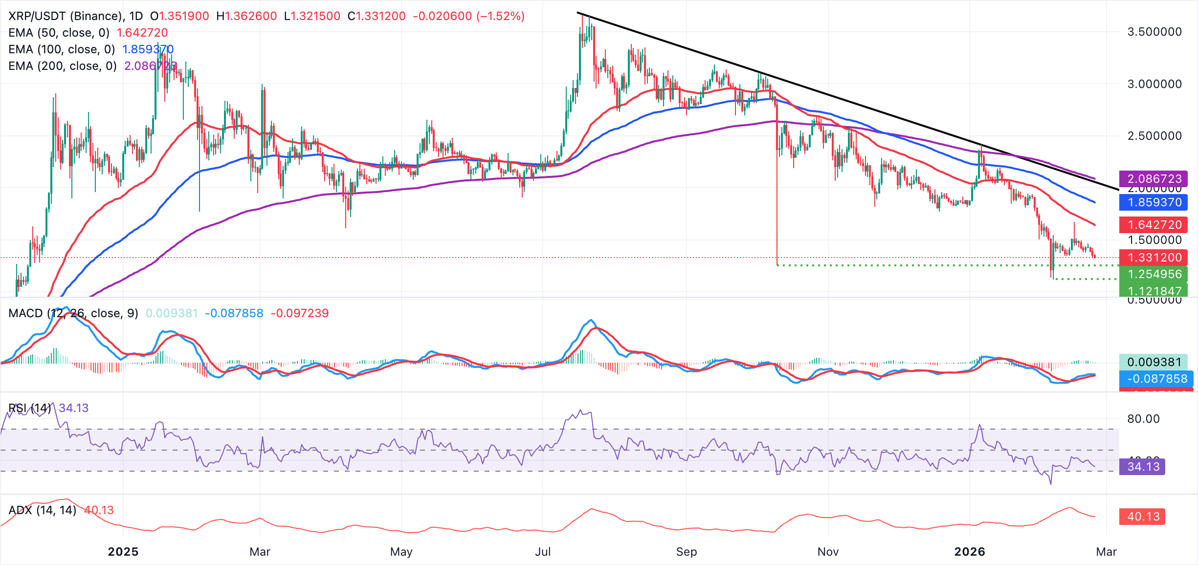 Meanwhile, XRP hovers at $1.33 amid near-term bearish bias. The price extends its slide well below the descending resistance trend line, and now trades beneath the 50-day, 100-day, and 200-day EMAs, which all hover above $1.64.