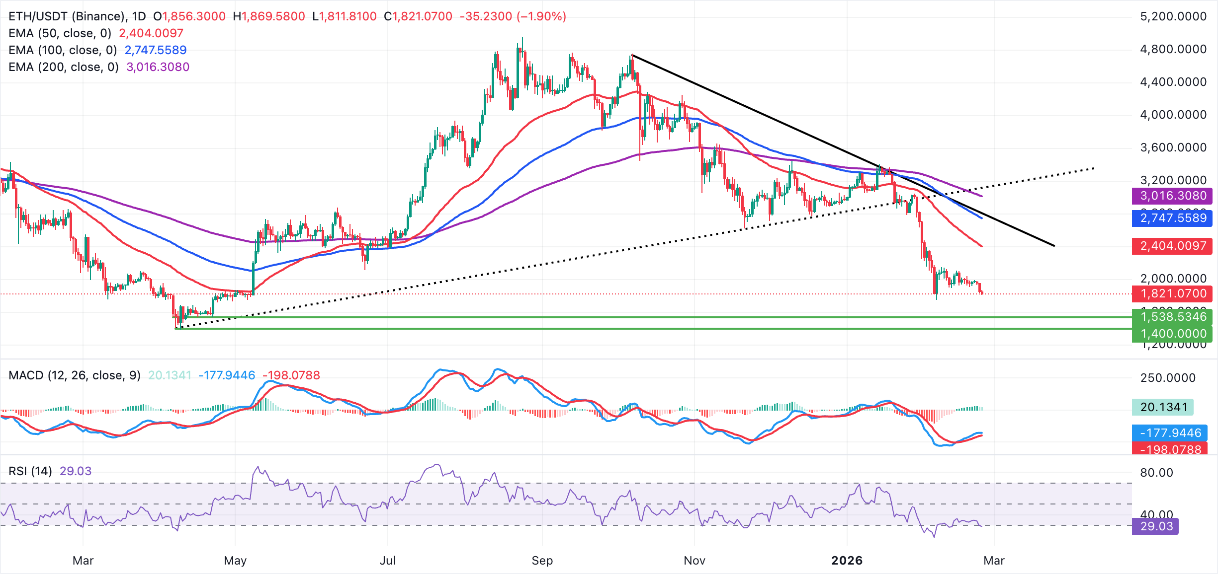 Ethereum is trading amid a general bearish bias, as price extends toward an intraday low of $1,811. Its daily closes sit well beneath the 50-, 100-, and 200-day EMAs clustered between roughly $2,400 and $3,000, underscoring an established downside phase. The smart contract token’s momentum remains weak, with the RSI below 30 and the MACD line above its signal line but still below the zero line, suggesting a bearish backdrop with only modest relief attempts.