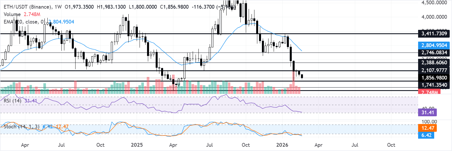 In the weekly chart, ETH/USDT trades at $1,856. The near-term bias is bearish as price holds below the declining 20-week Exponential Moving Average (EMA) near $2,800 and extends the sequence of lower weekly highs.