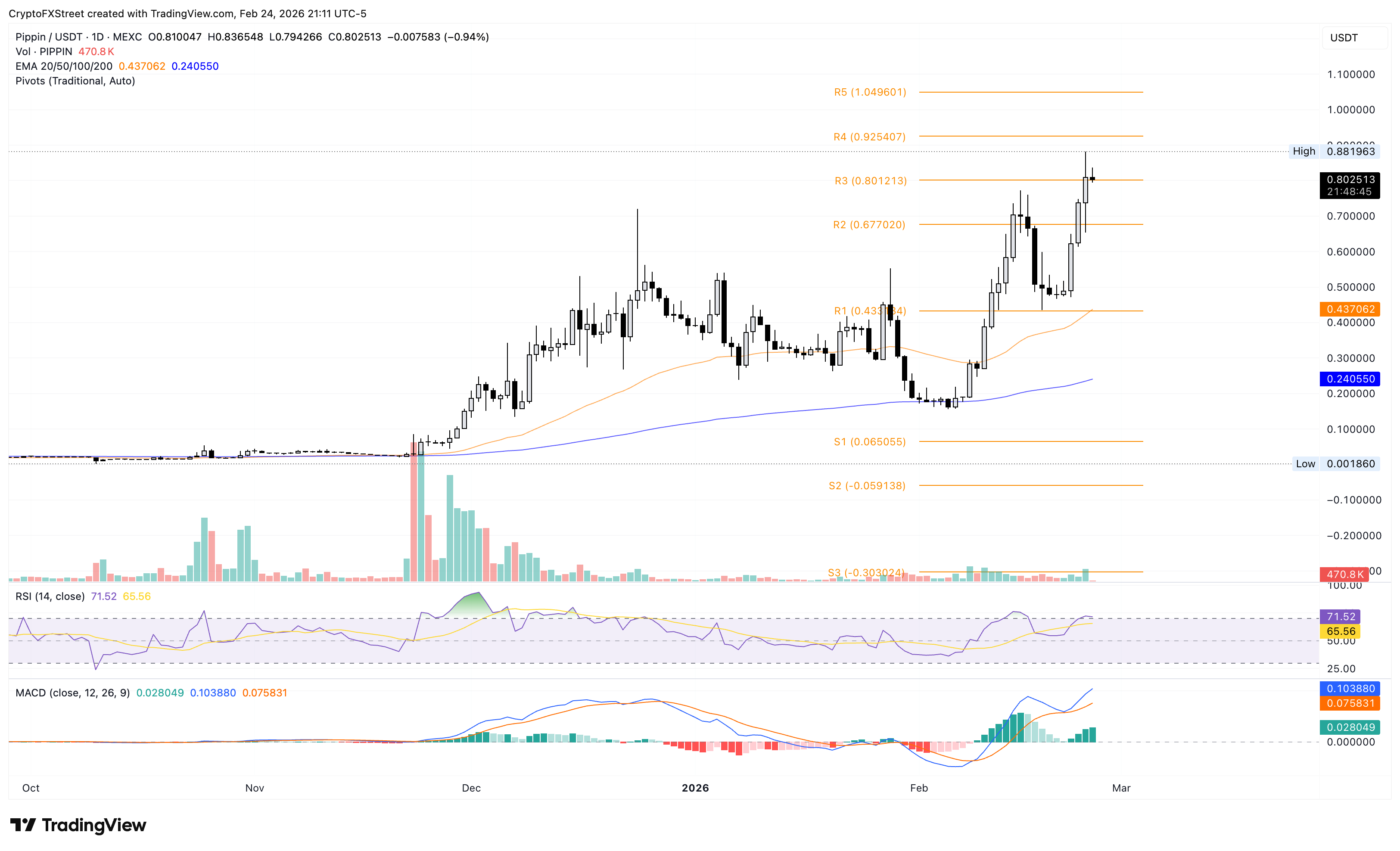 PIPPIN shows a U-shaped reversal on the daily chart from the R1 pivot point at $0.4331, resulting in a four-day rally from Saturday, totaling roughly 70% gains. At the time of writing, PIPPIN trades above the R3 pivot point at $0.8012.