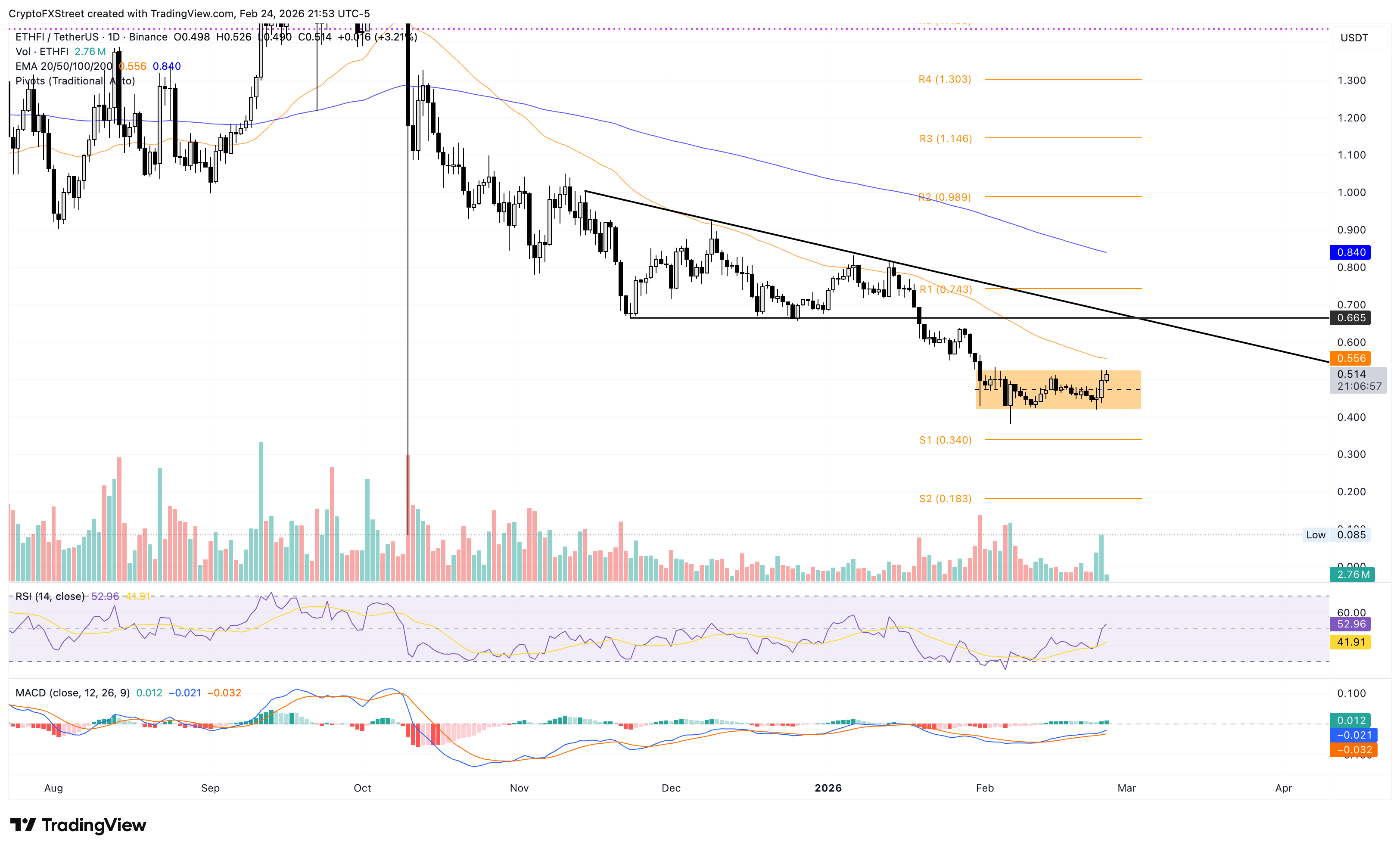 A decisive close above $0.527 would confirm the range breakout and target the 50-day EMA at $0.556. If Ether.fi exceeds the moving average, it could target the support-turned-resistance level at $0.665, which coincides with a descending trendline connecting the November 14 and January 14 highs.
