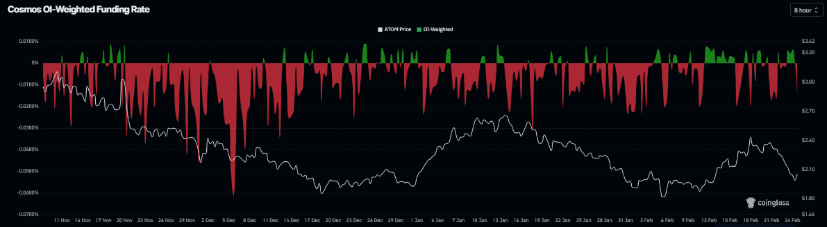 On the derivatives side, ATOM’s negative funding rates further project bearish sentiment. The metric turns negative on Wednesday and stands at -0.0147%, nearing levels seen on Sunday, when ATOM prices dropped sharply the next day. The negative ratio suggests that shorts are paying longs, suggesting bearish sentiment toward Cosmos Hub.