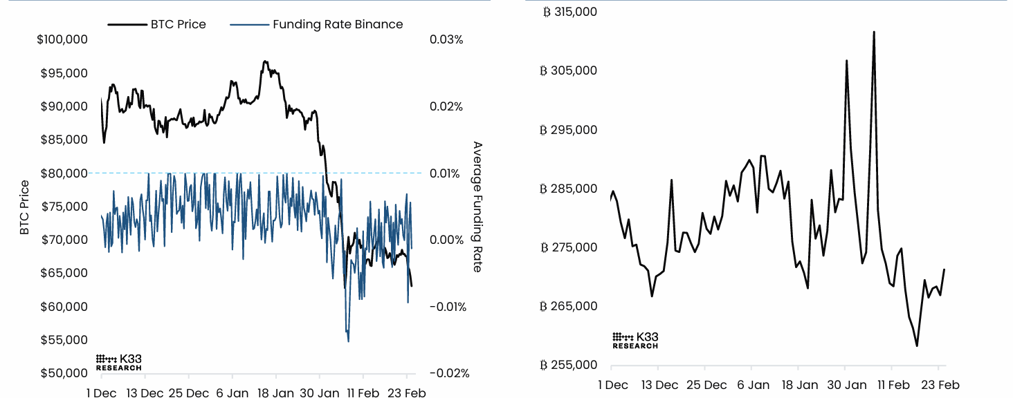 A K33 Research report on Tuesday highlighted that traders continue to move defensively in BTC perpetual markets.