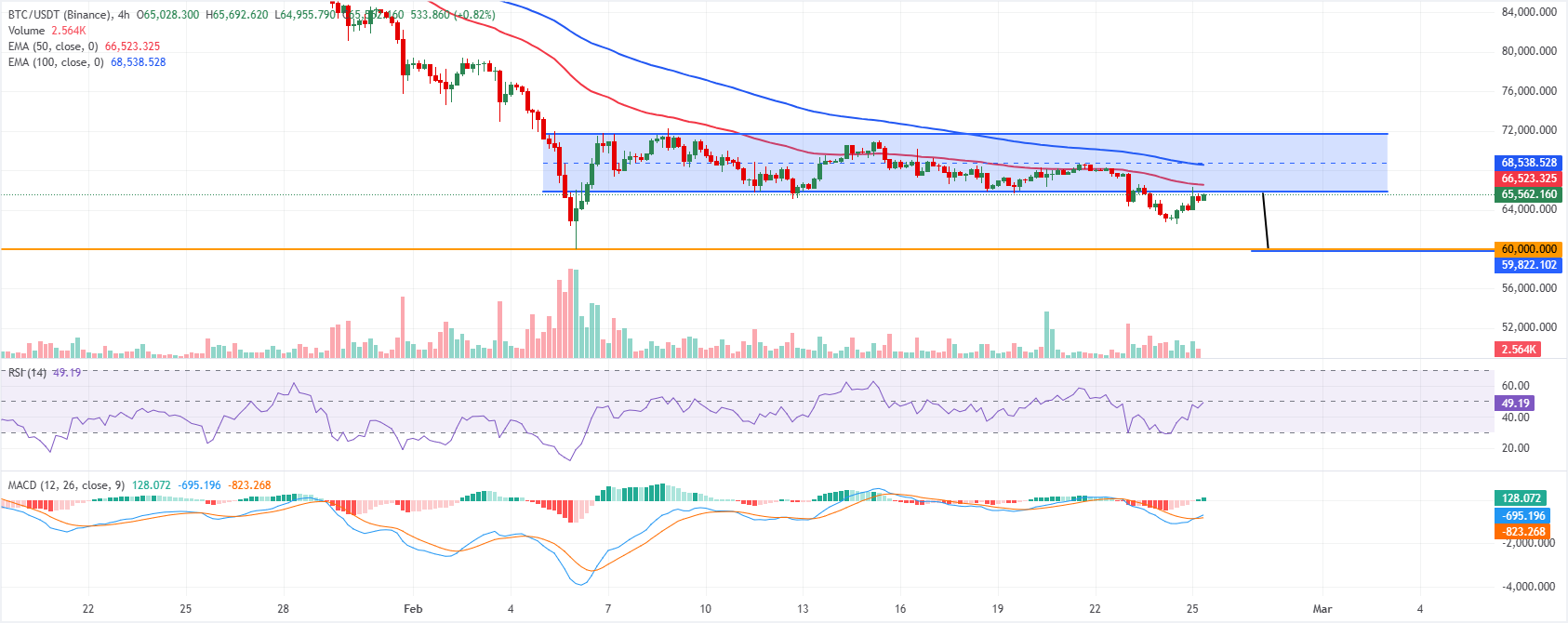 A sustained break above $68,500 would soften the bearish tone, with a recovery toward the upper consolidating boundary near $71,700, while a drop back through $63,000 would expose $60,000 first, then toward the technical target of $58,822.