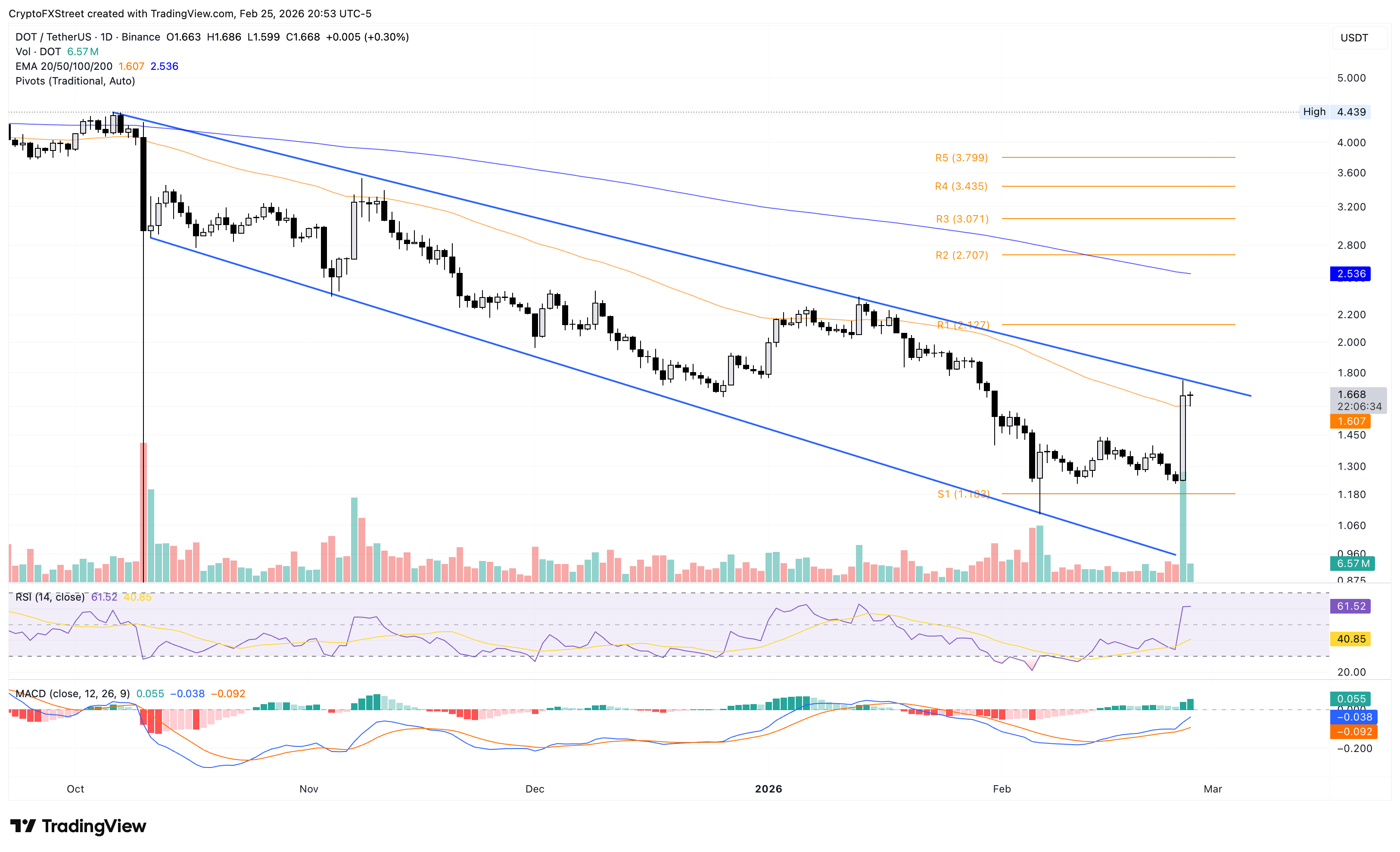 Polkadot is trading above $1.60 at the time of writing on Thursday, following a 34% rally the previous day. The near-term bias turns cautiously bullish as DOT tests a long-running descending trendline at $1.75, which capped gains on Wednesday and is part of a falling channel pattern.