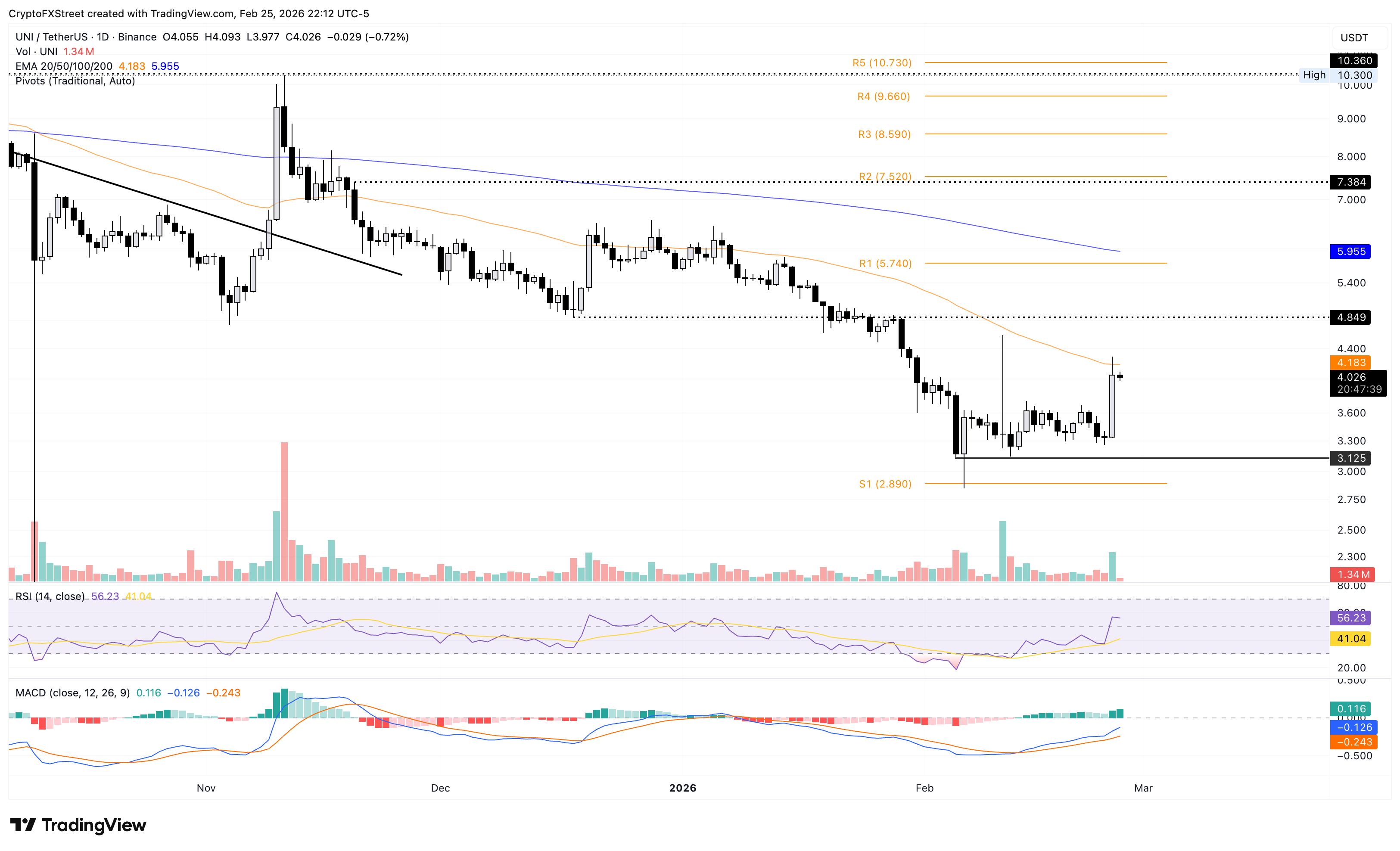 Uniswap hovers above $4.00 at press time on Thursday, sustaining the 21% rebound from Wednesday. The near-term bias turns mildly bullish after the rebound, but the declining 50-day exponential moving average at $4.18 caps the recovery.