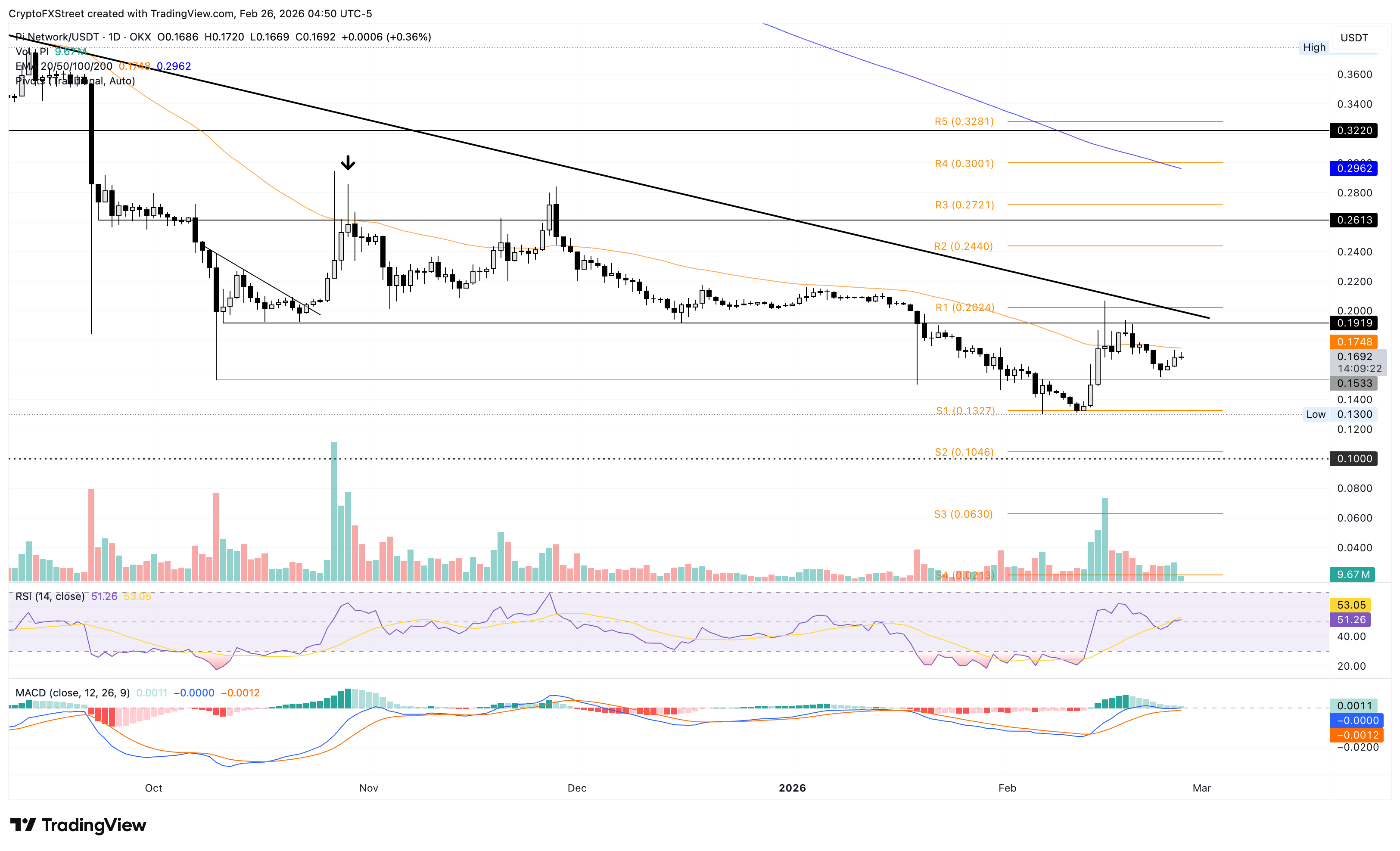 If PI clears the 50-day EMA at $0.1748, it could test the initial resistance at the October 11 low of $0.1919, close to a descending resistance trendline, which connects the August 30, 2025, and February 15, 2026, highs.