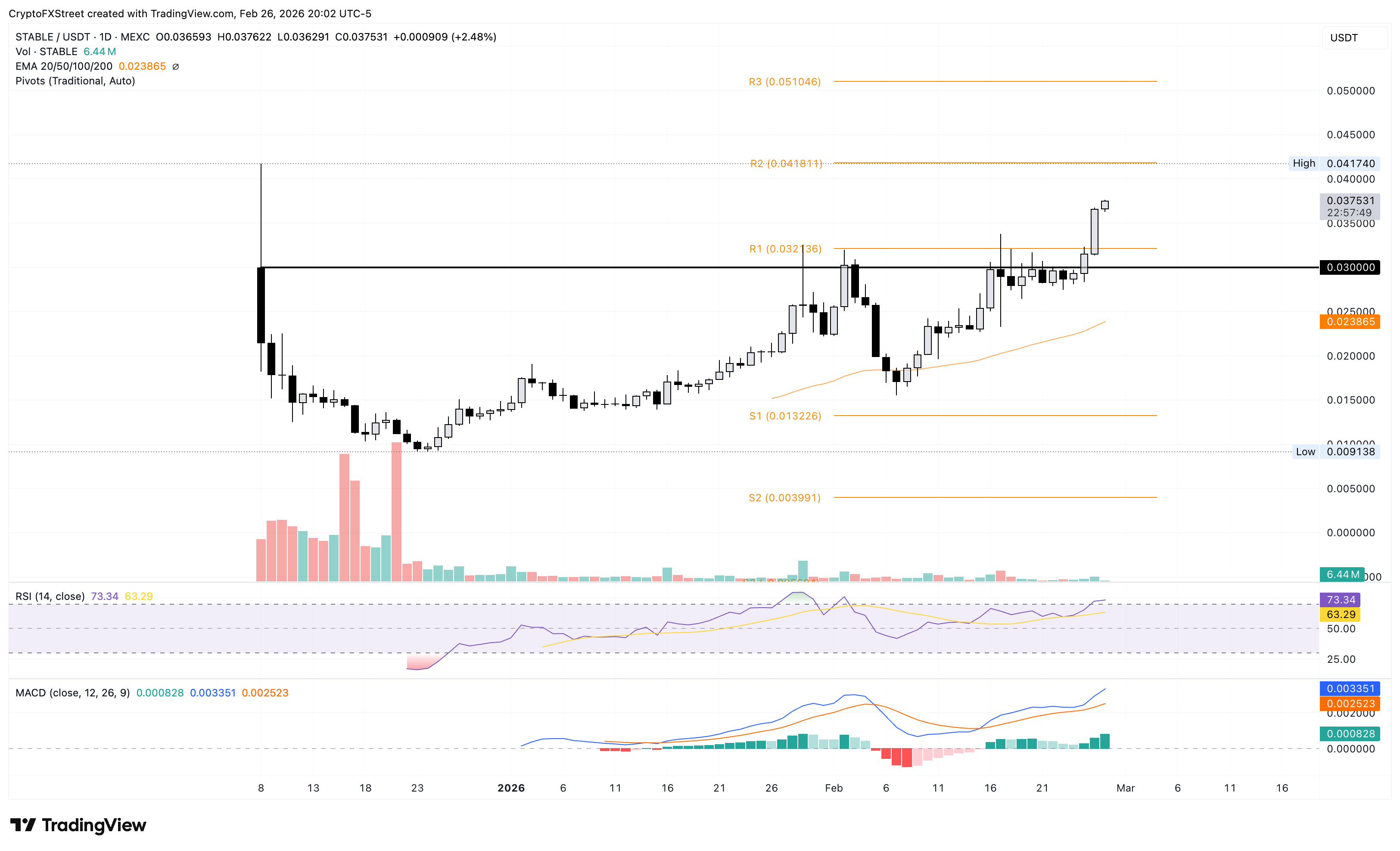 The R2 Pivot Point at $0.04181 serves as the initial resistance for Stable.