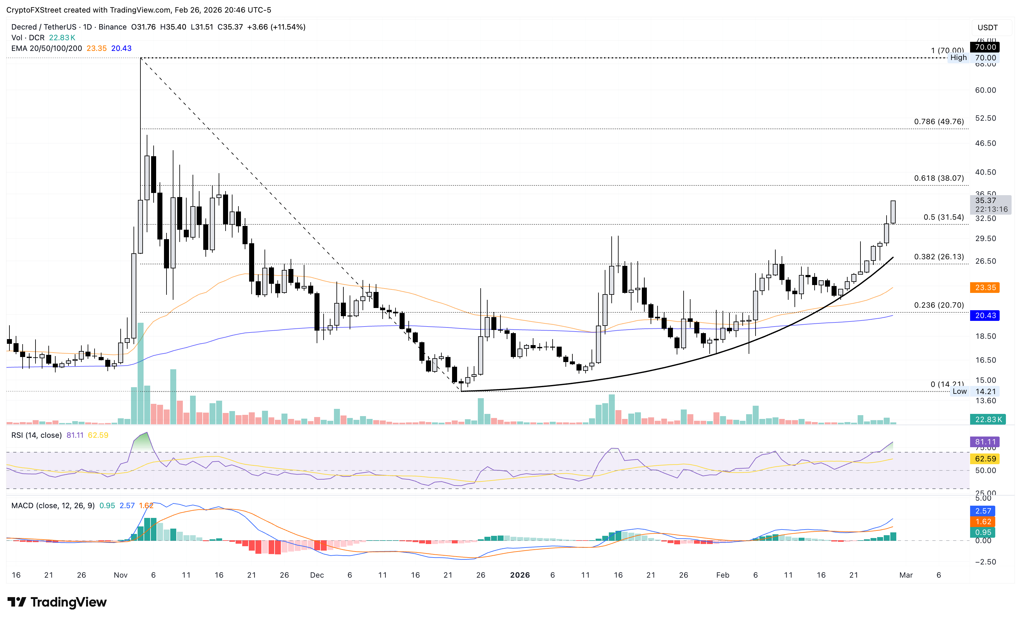Decred edges higher by 10% at press time on Friday, building on Thursday’s 10% rise and marking its eighth consecutive day of uptrend. The DCR token crosses the $35.00 mark and approaches the 61.8% Fibonacci retracement level at $38.07, measured from the November 4 high of $70.00 to the December 23 low of $14.21.