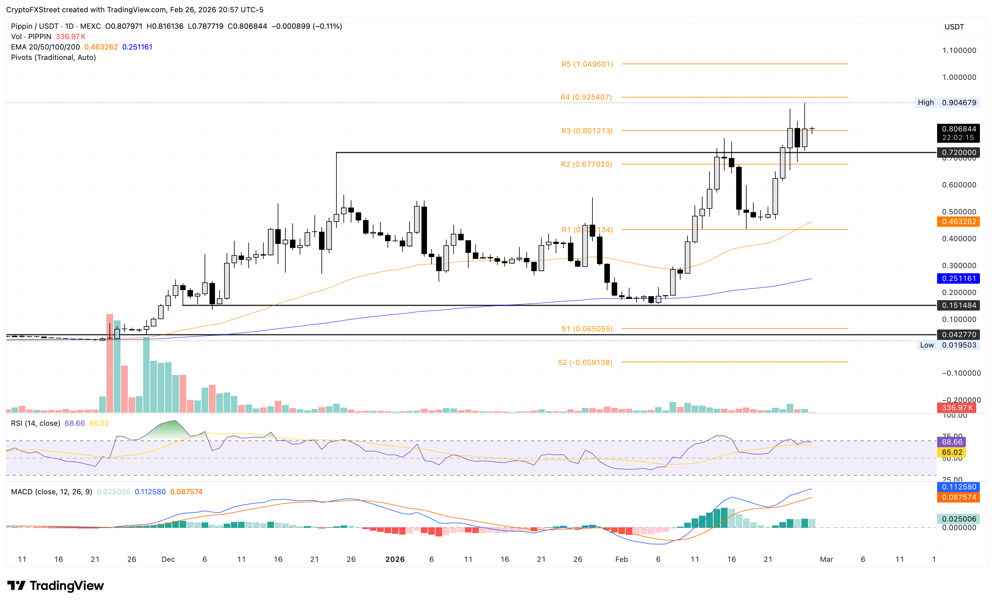 Pippin trades around $0.80 at the time of writing on Friday, holding steady after a 9% rebound the previous day. The meme coin is trading near record high levels as it tests the R3 Pivot Point at $0.8012.