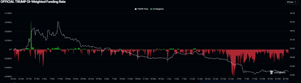 TRUMP’s derivatives data supports a bearish bias. The meme coin funding rate flipped negative on Wednesday and stands at -0.019% on Friday, according to CoinGlass. The negative metric suggests that shorts are paying longs, suggesting bearish sentiment toward Official Trump.